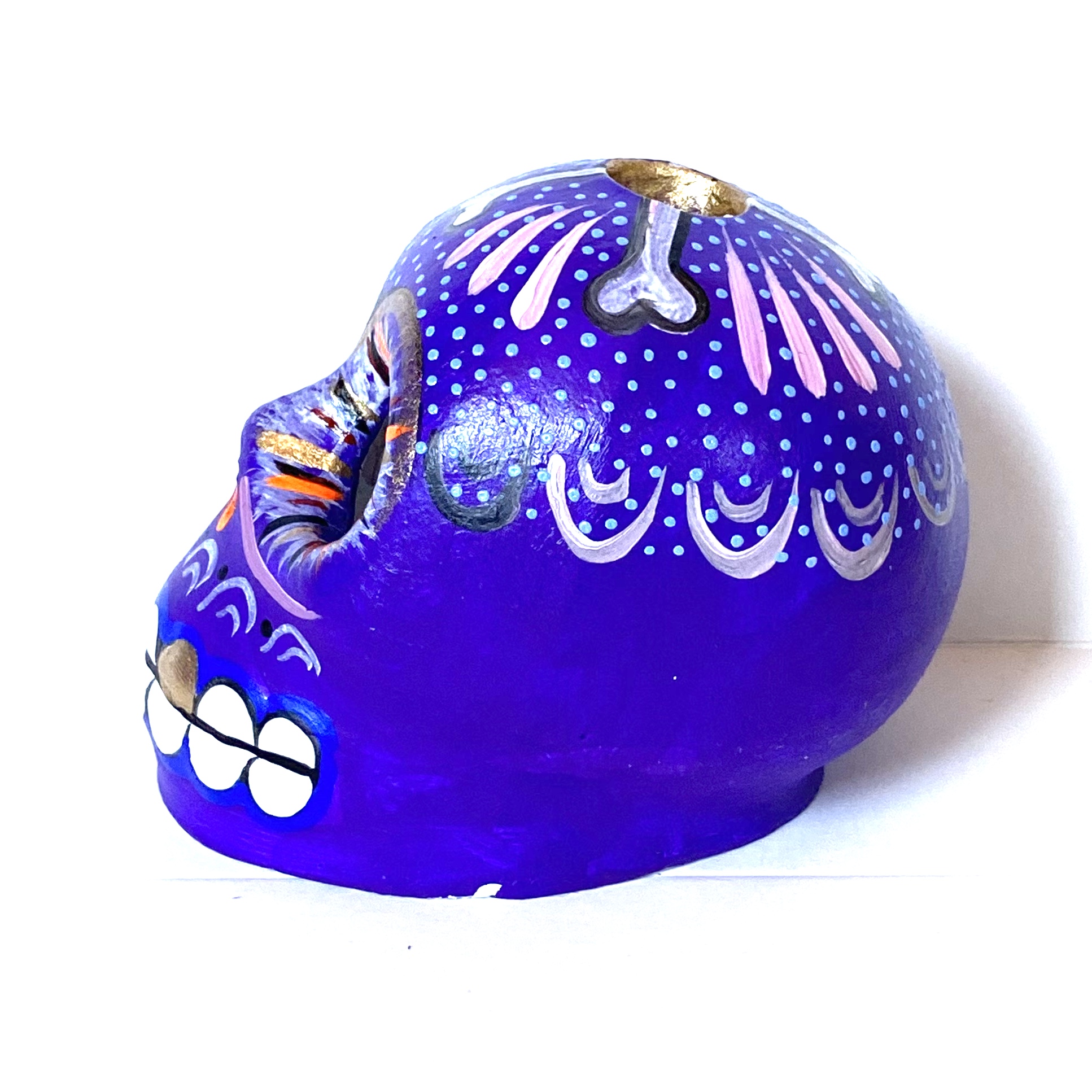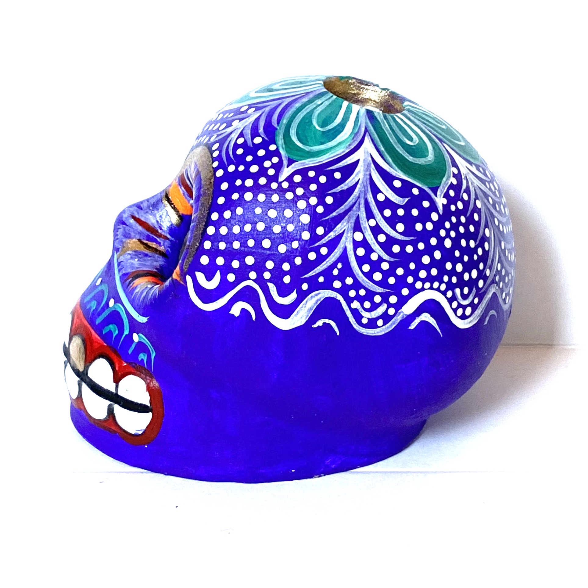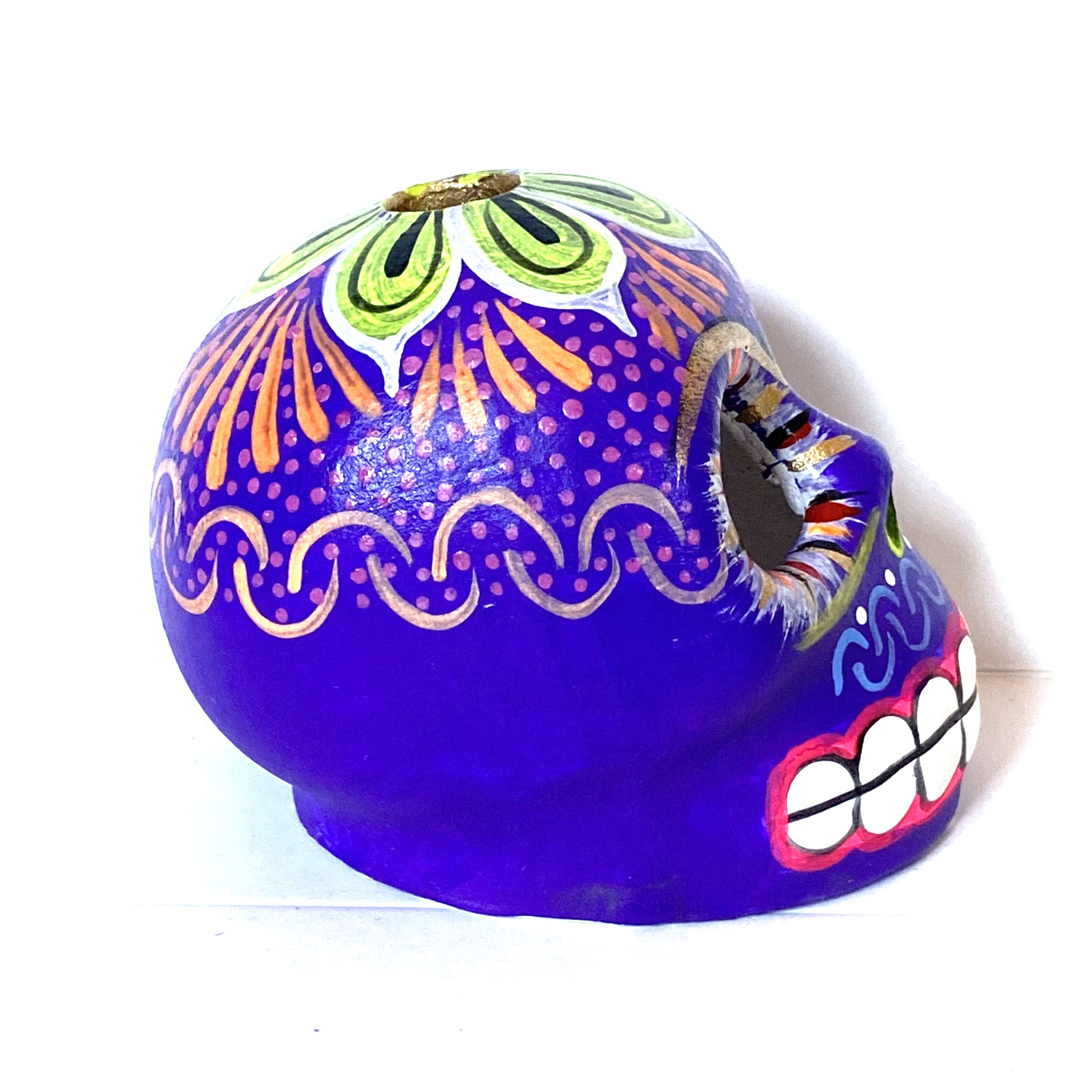 La Calavera è un oggetto decorative realizzato in terracotta proveniente della zona di Oaxaca. Il teschio è realizzato e dipinto a mano da esperti artigiani. Questo complemento d’arredo può essere posizionato su una superficie piatta come un tavolino o una mensola.