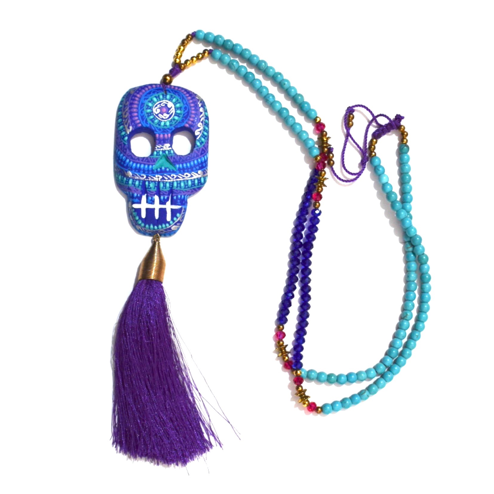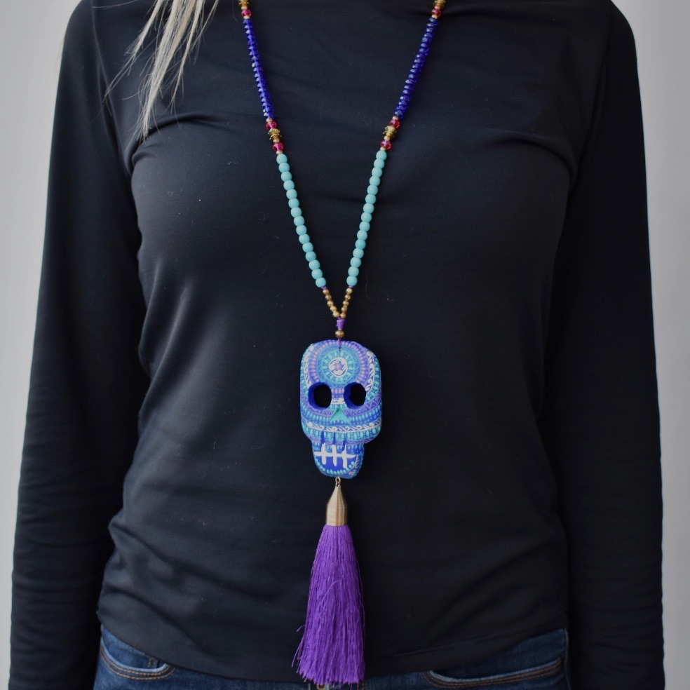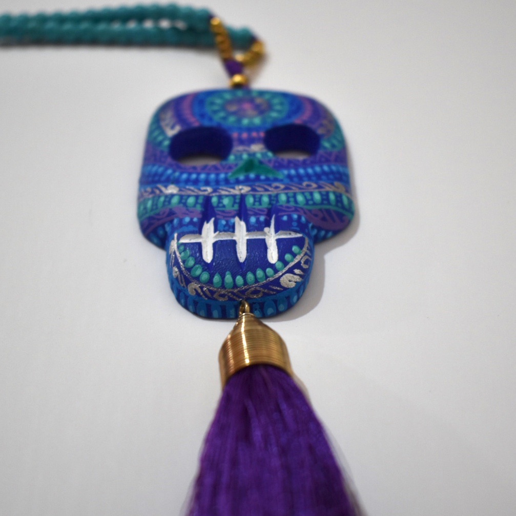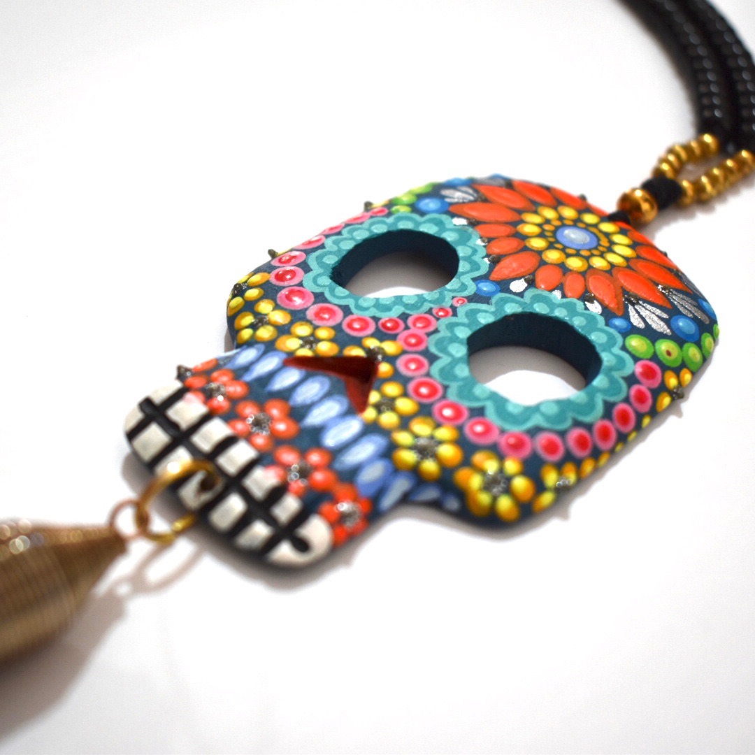 Nella tradizione messicana la morte è un evento pieno di folclore e colore e i teschi stessi sono simbolo di “buena suerte”. Il ciondolo di questa collana è in legno intagliato e dipinto a mano da un’artista di Oaxaca.