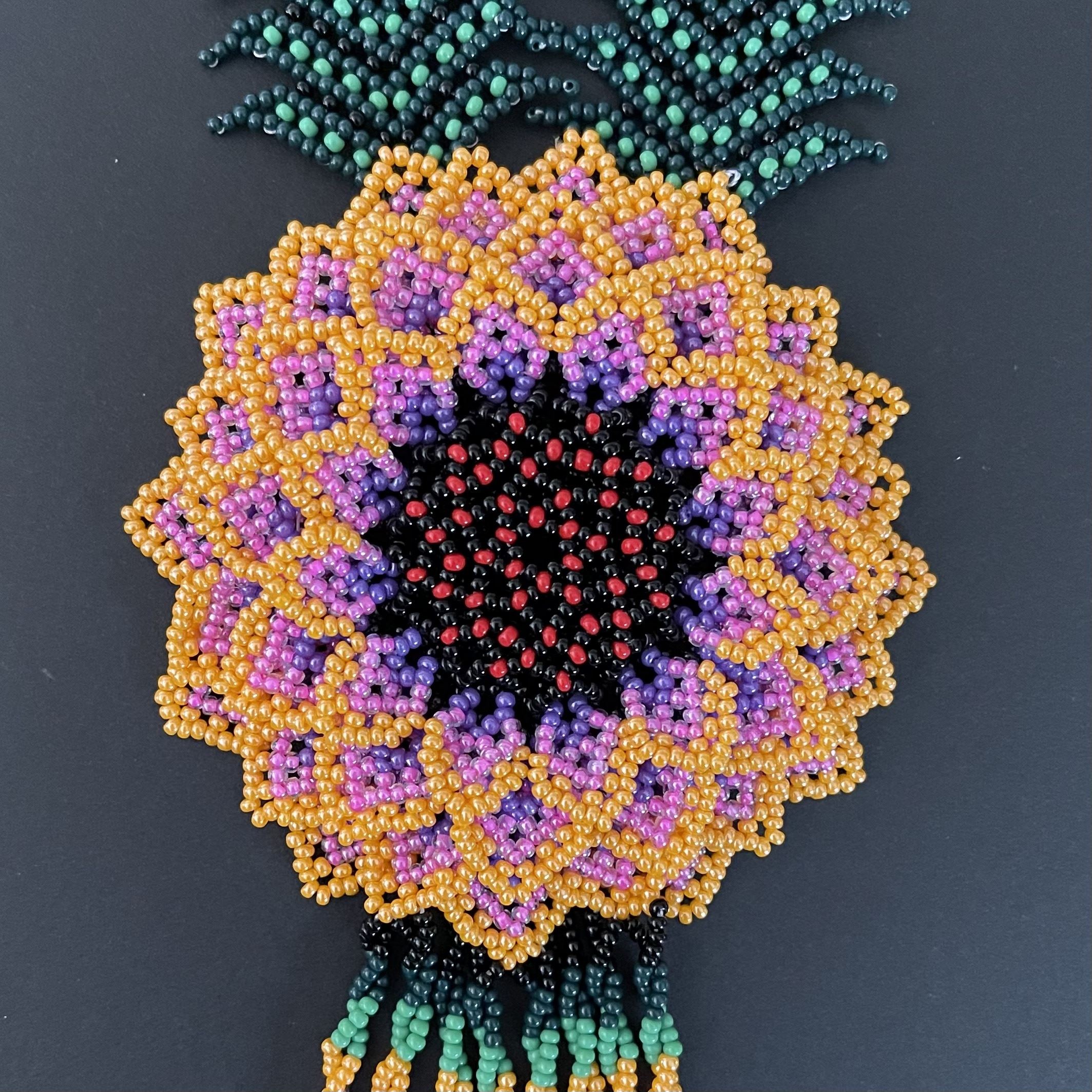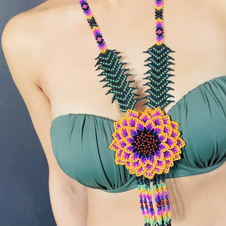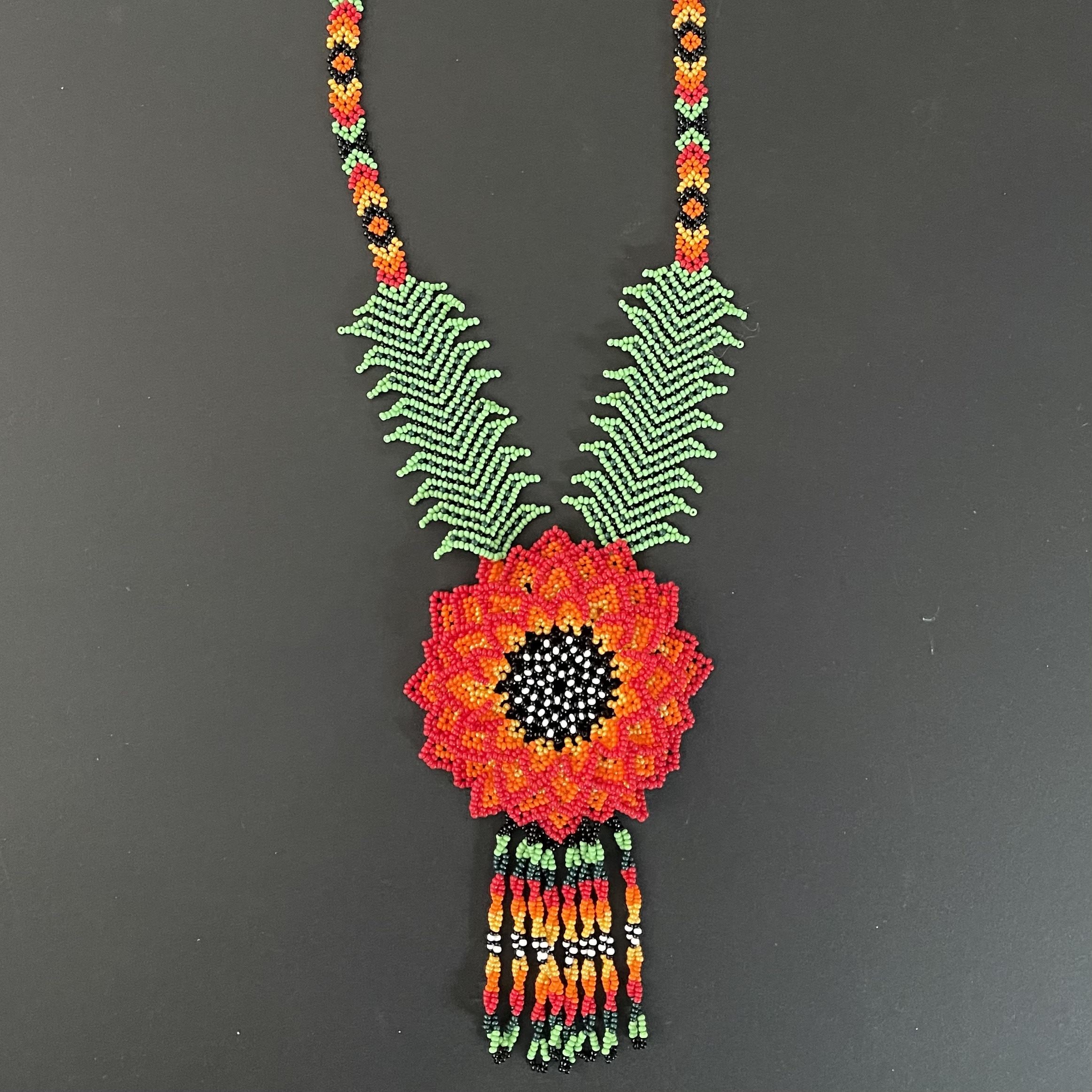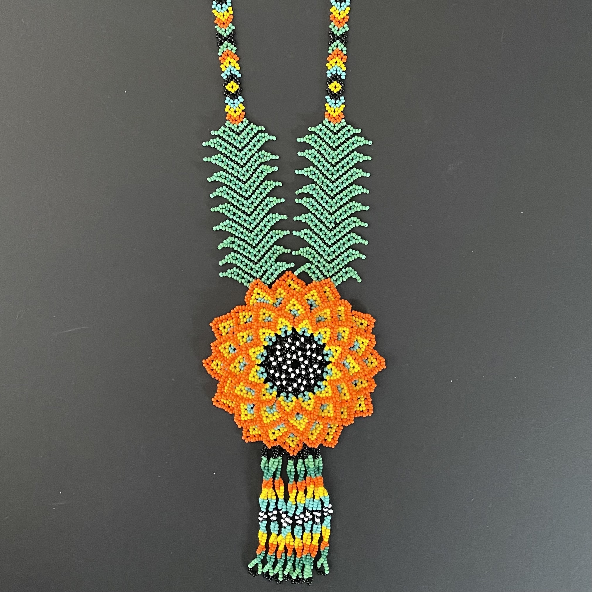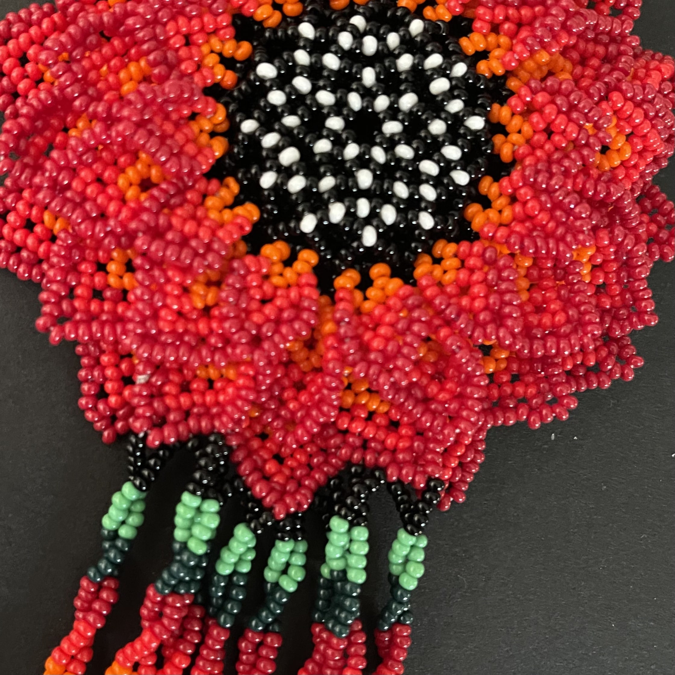 Fiore gigante Huichol, tecnica di lavorazione: le chaquiras multicolore (perline di vetro) vengono intrecciate una ad una fino a completare i disegni degli accessori; Nella sua elaborazione l’artista Huichol sviluppa forme e disegni con simboli rappresentativi della sua cultura e tradizione.