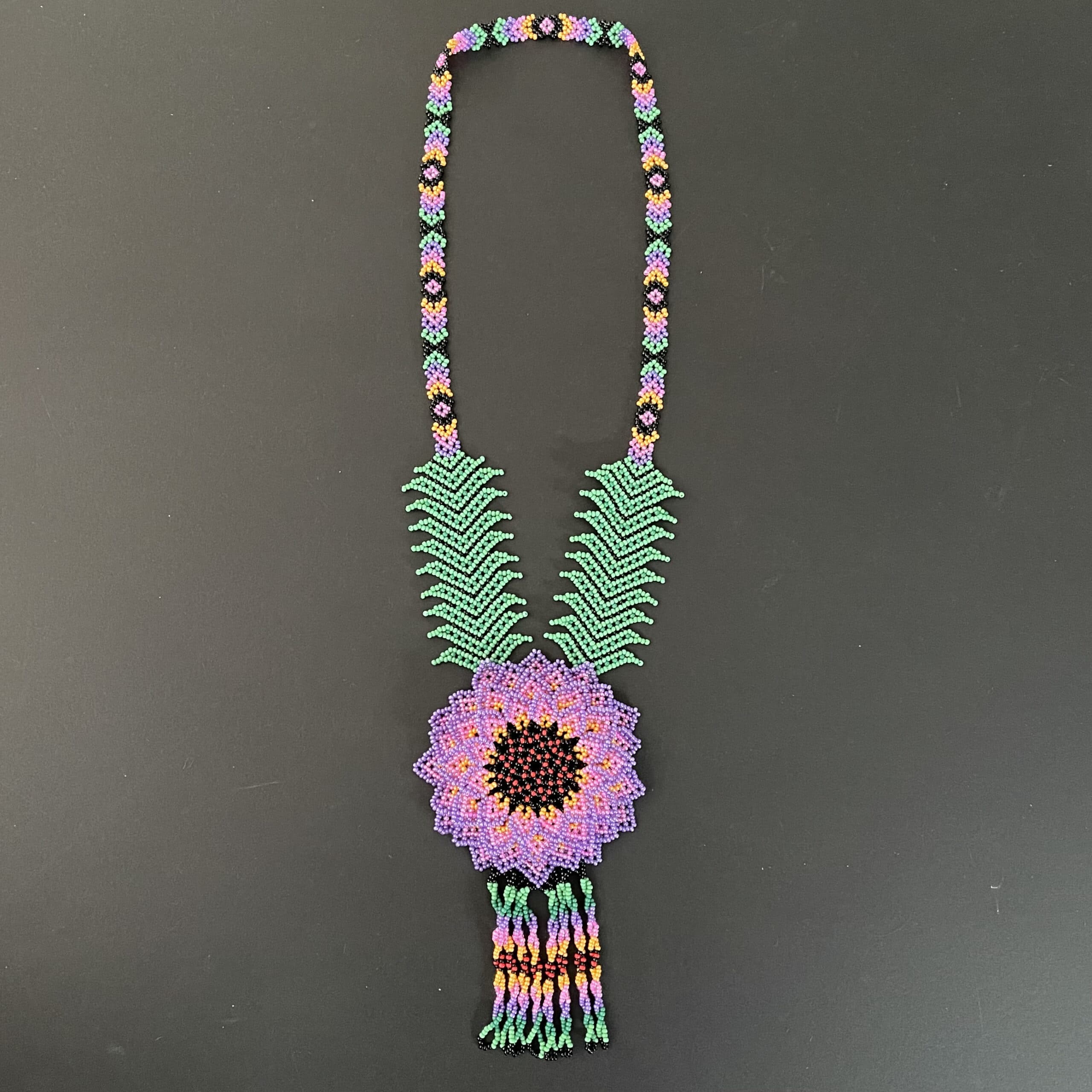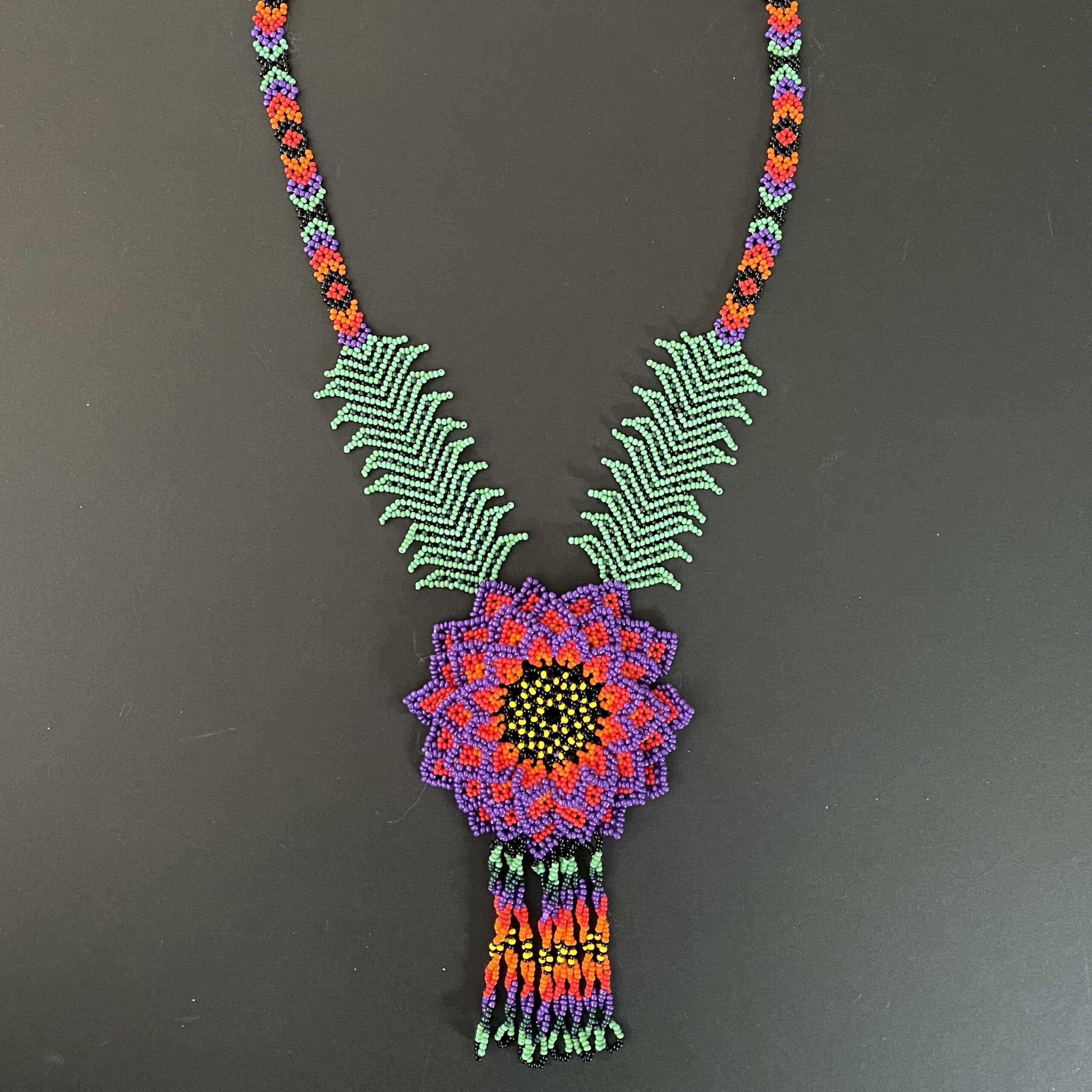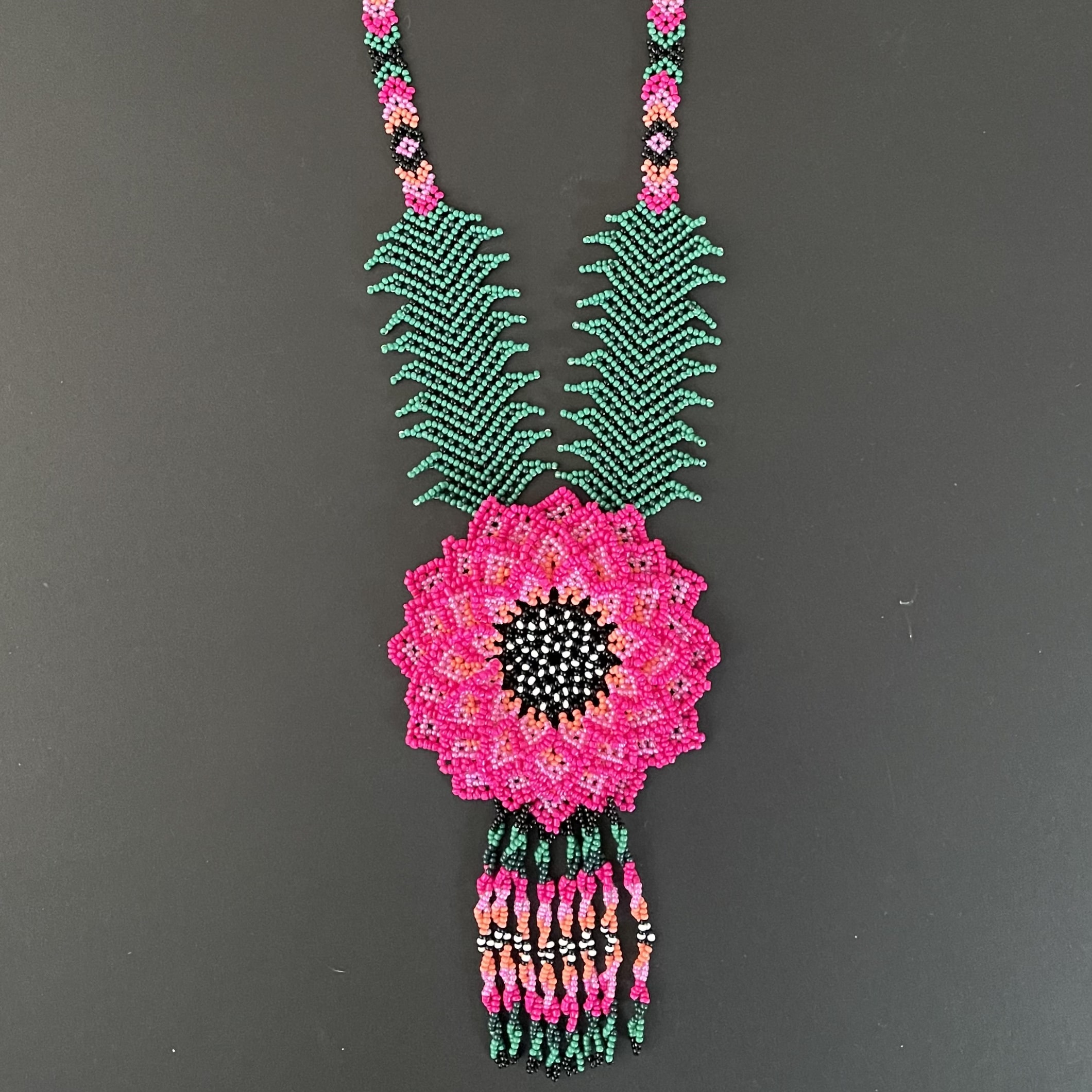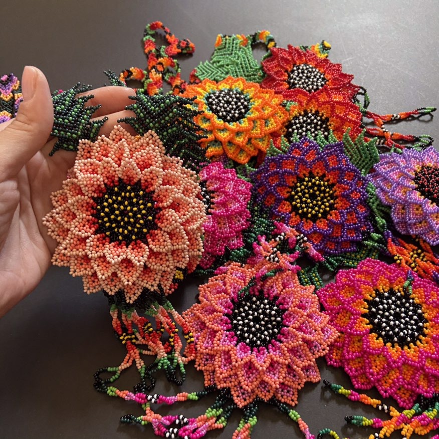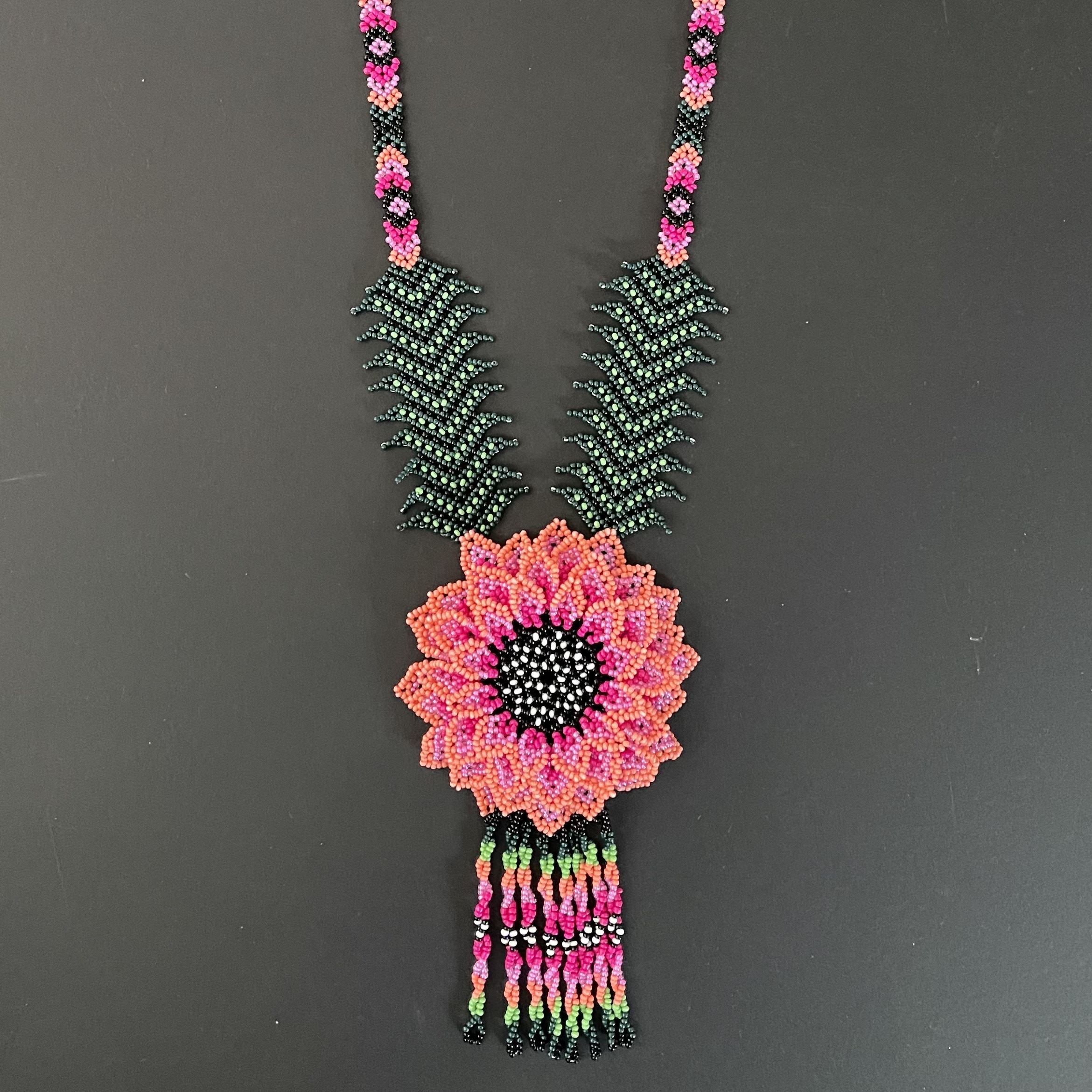 Fiore gigante Huichol, tecnica di lavorazione: le chaquiras multicolore (perline di vetro) vengono intrecciate una ad una fino a completare i disegni degli accessori; Nella sua elaborazione l’artista Huichol sviluppa forme e disegni con simboli rappresentativi della sua cultura e tradizione.