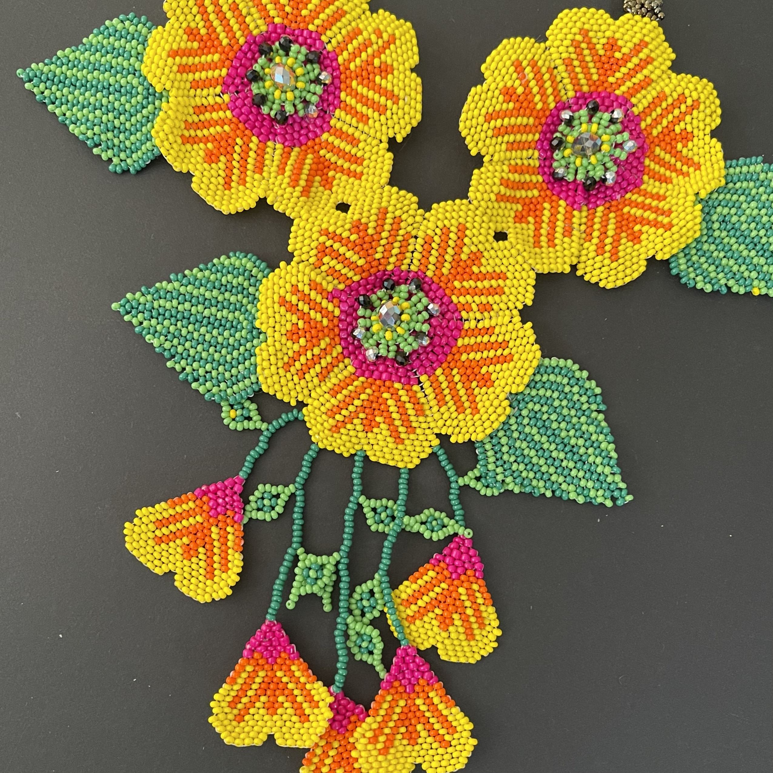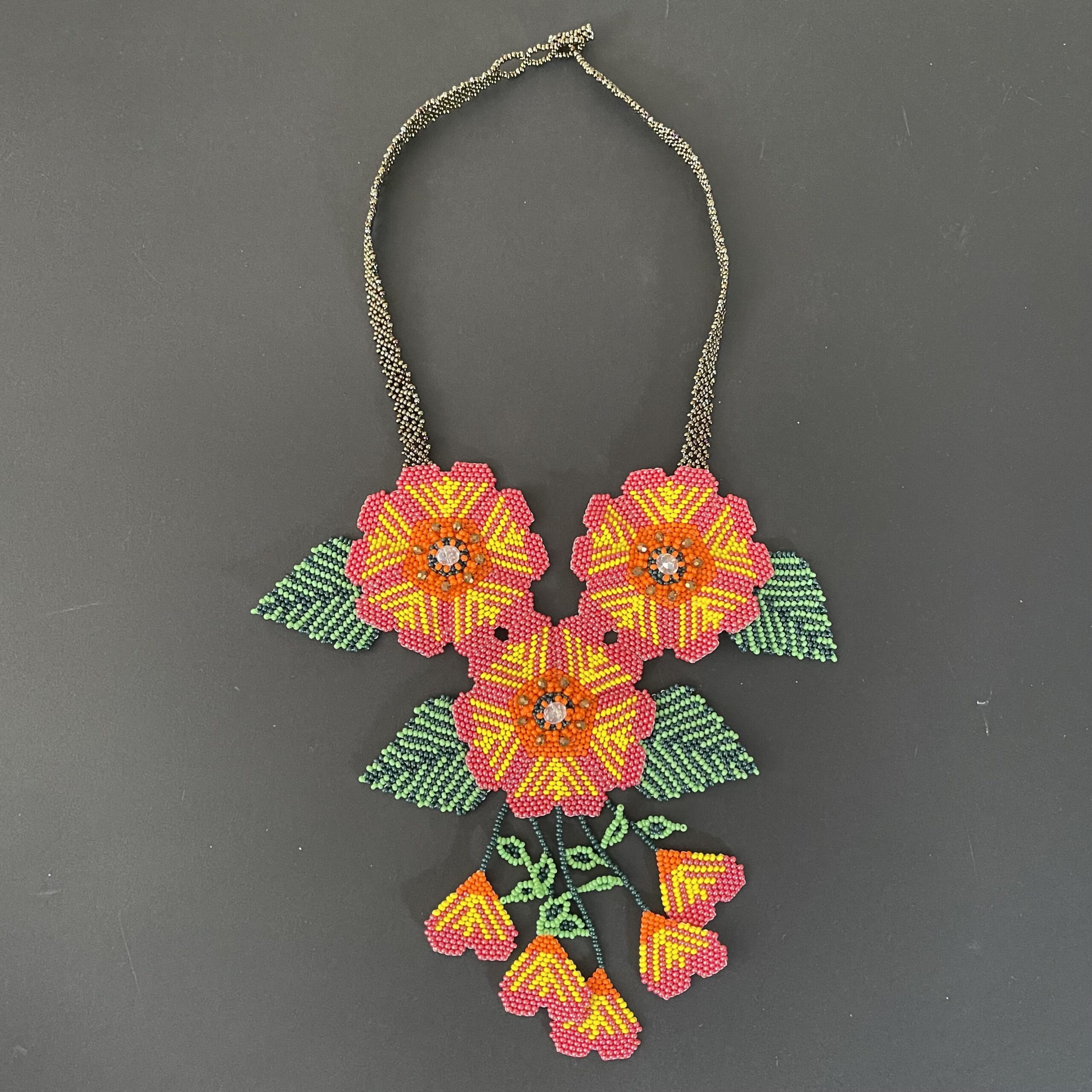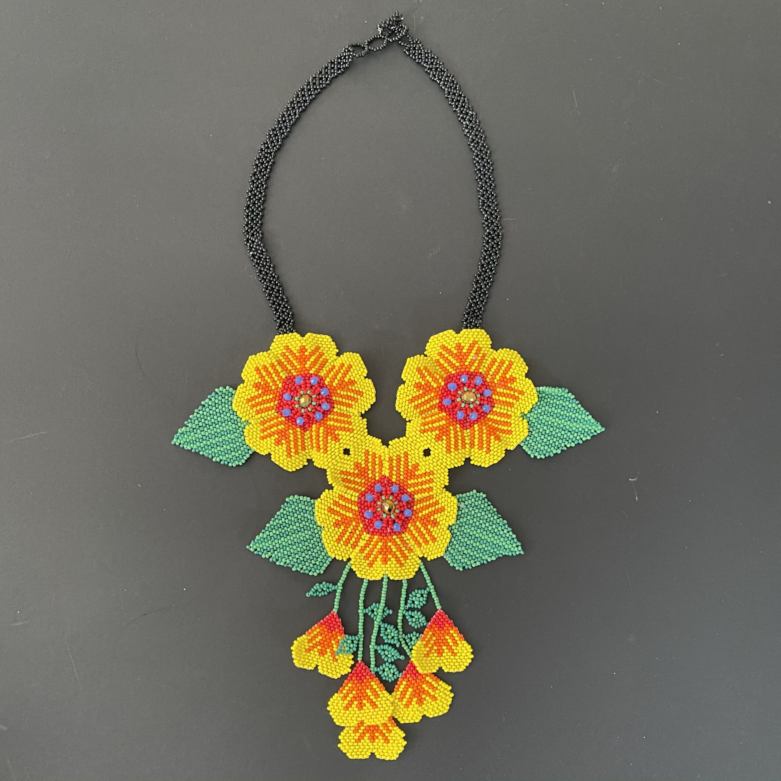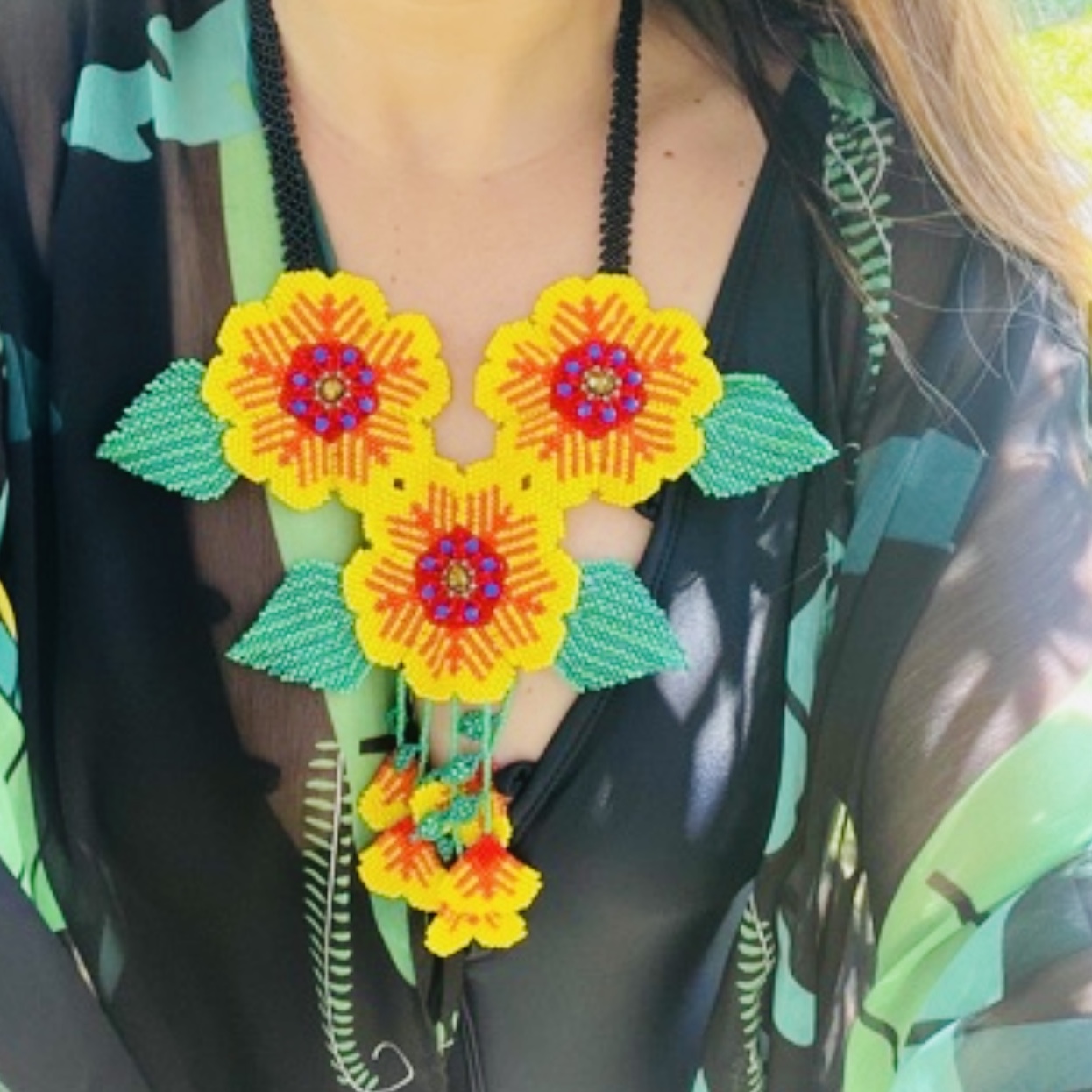 Completo collana orecchini e bracciale Huichol, tecnica di lavorazione: le chaquiras multicolore (perline di vetro) vengono intrecciate una ad una fino a completare i disegni degli accessori; Nella sua elaborazione l’artista Huichol sviluppa forme e disegni con simboli rappresentativi della sua cultura e tradizione.