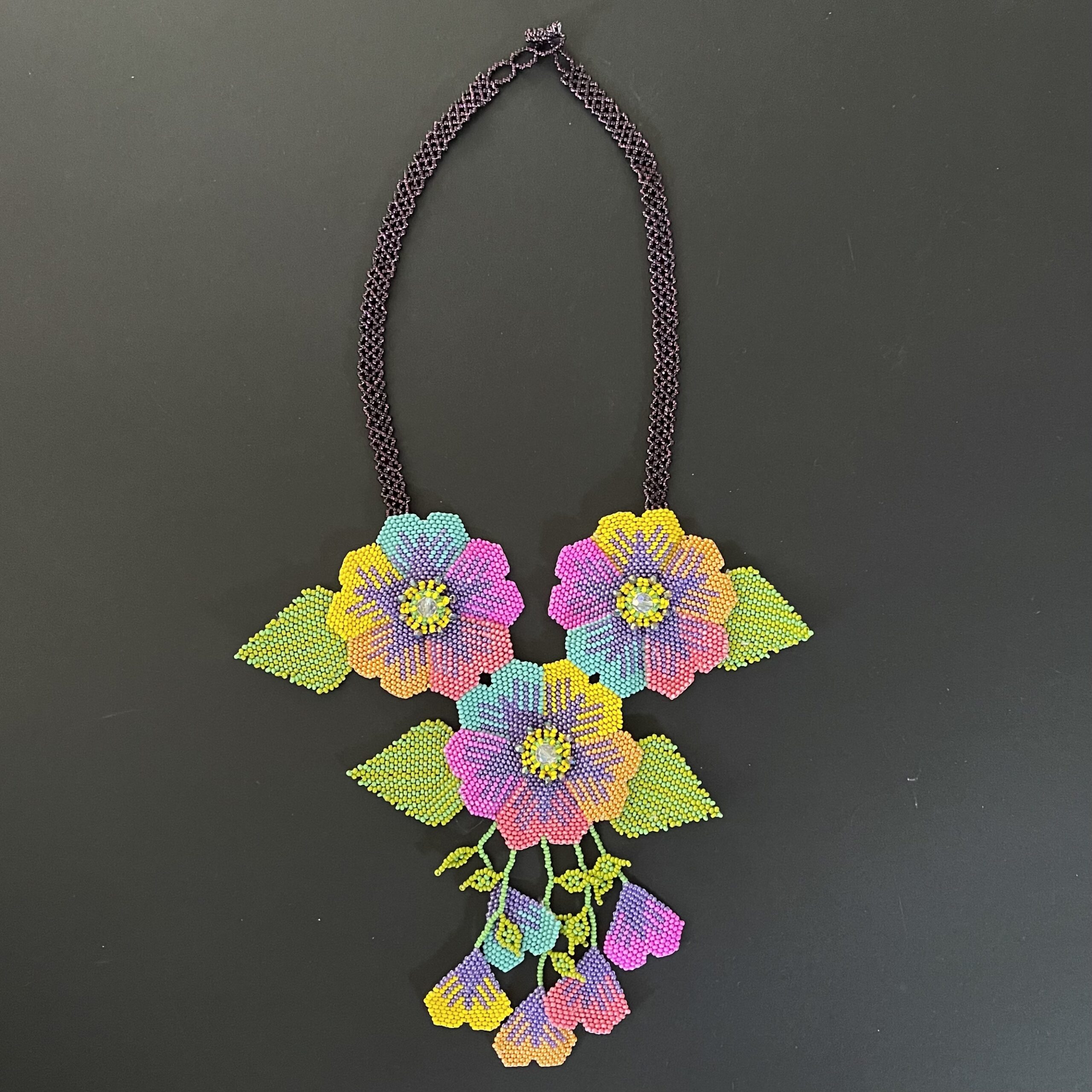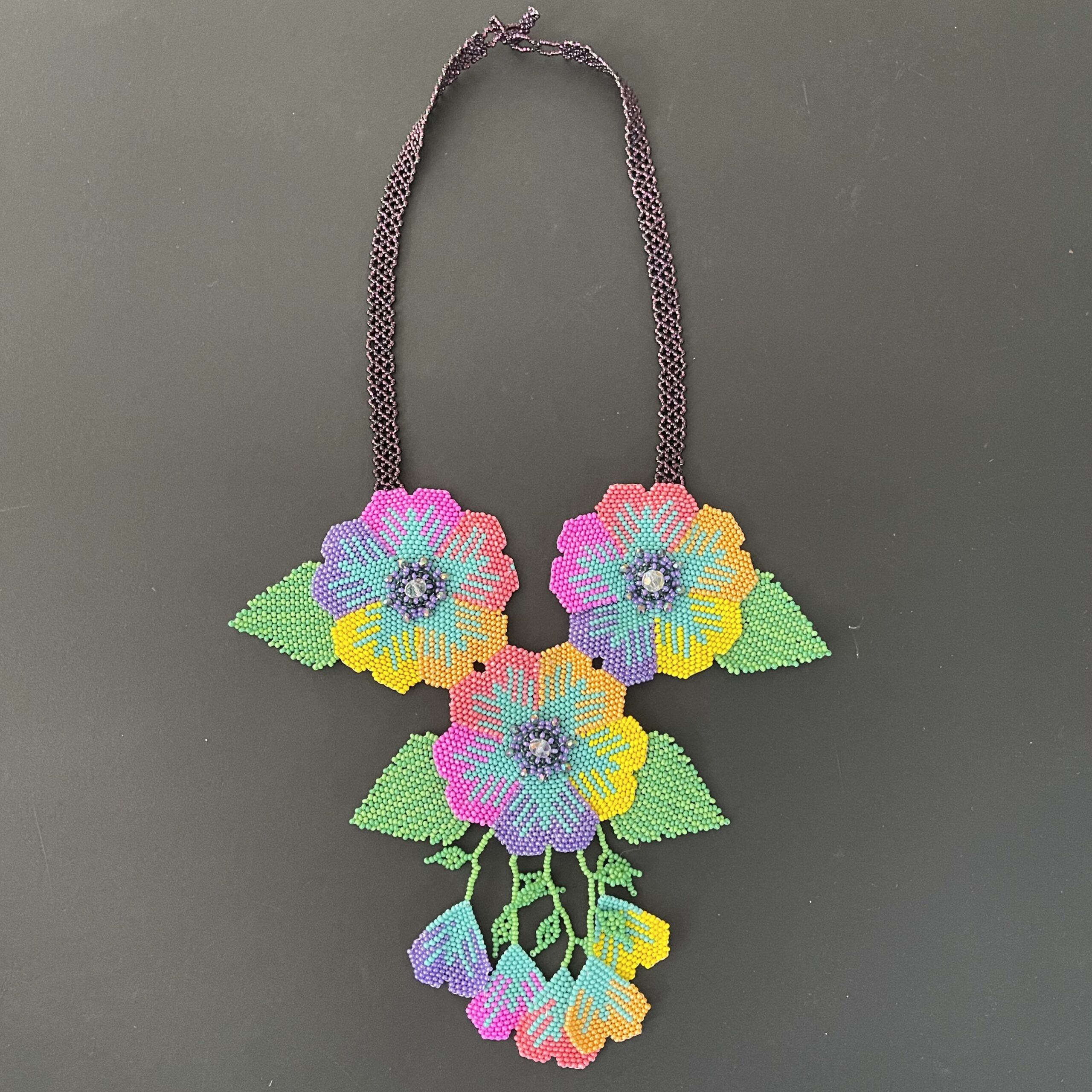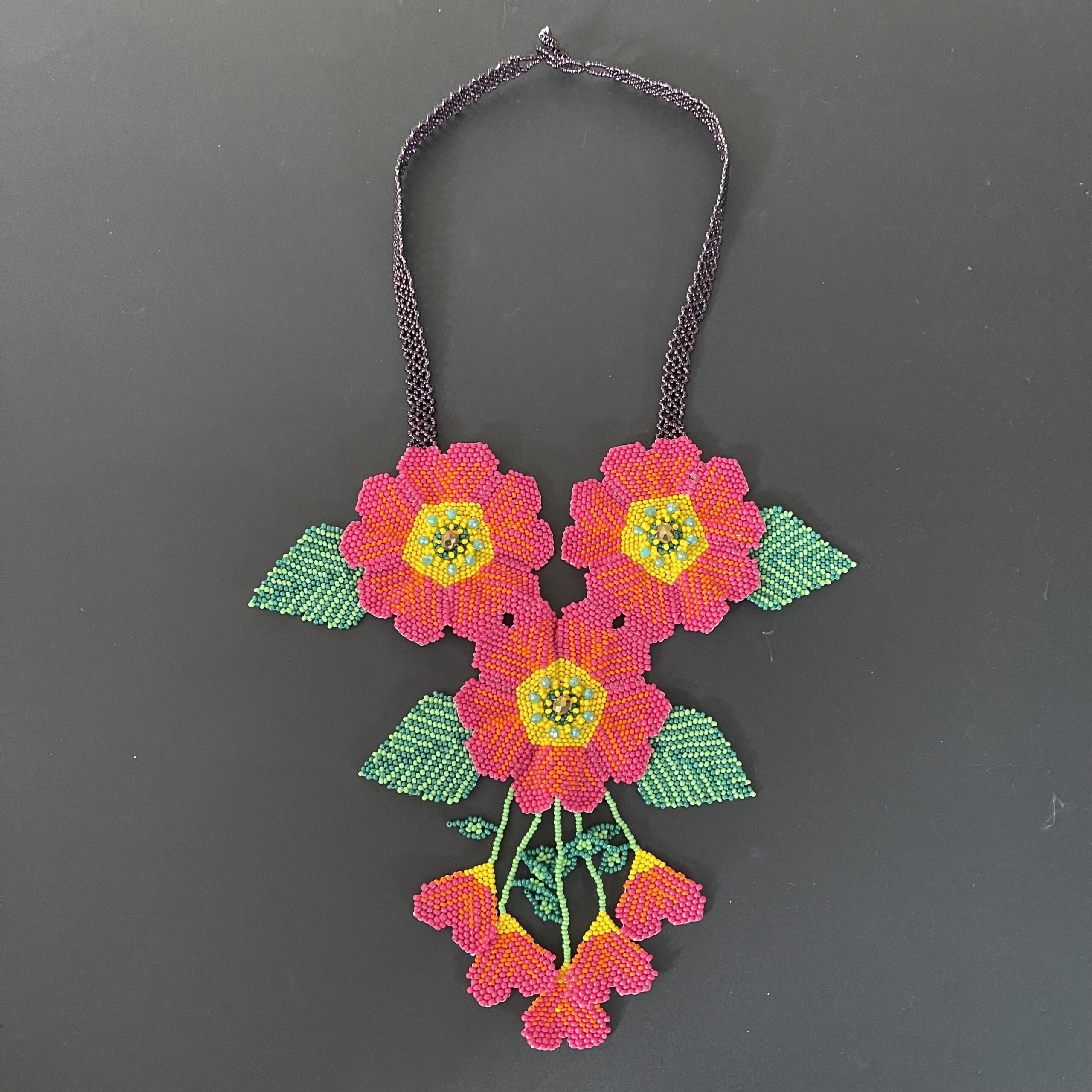 Completo collana orecchini e bracciale Huichol, tecnica di lavorazione: le chaquiras multicolore (perline di vetro) vengono intrecciate una ad una fino a completare i disegni degli accessori; Nella sua elaborazione l’artista Huichol sviluppa forme e disegni con simboli rappresentativi della sua cultura e tradizione.