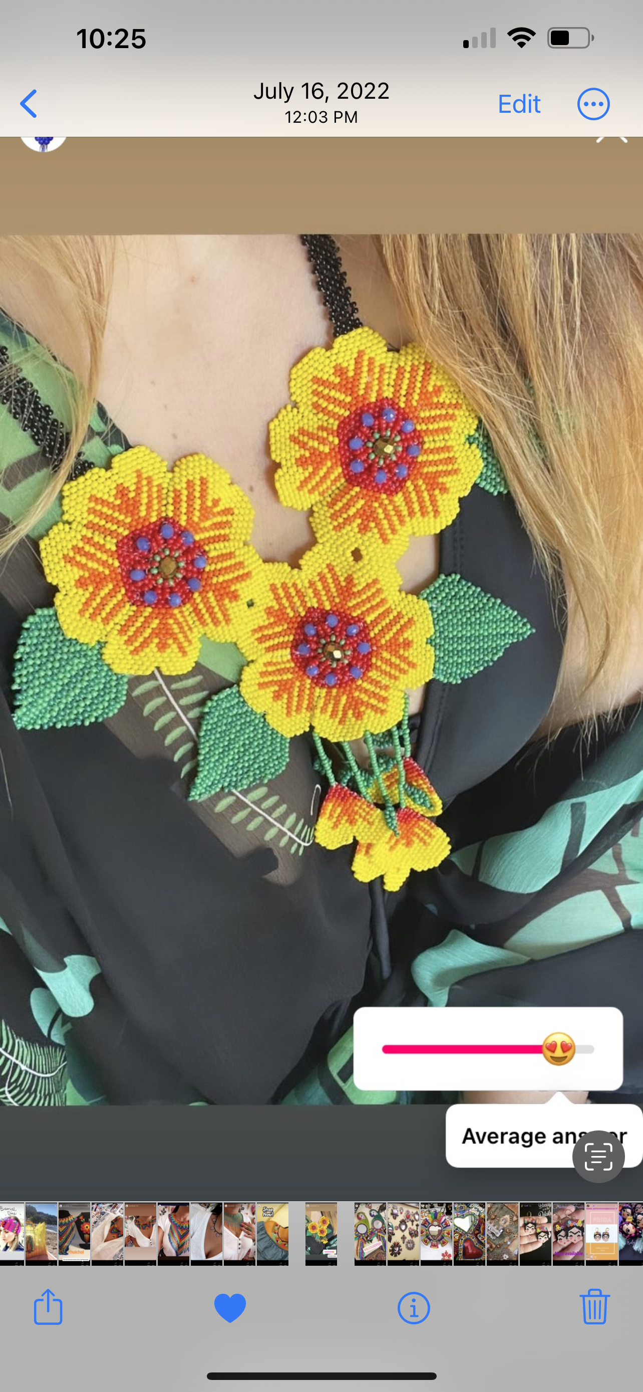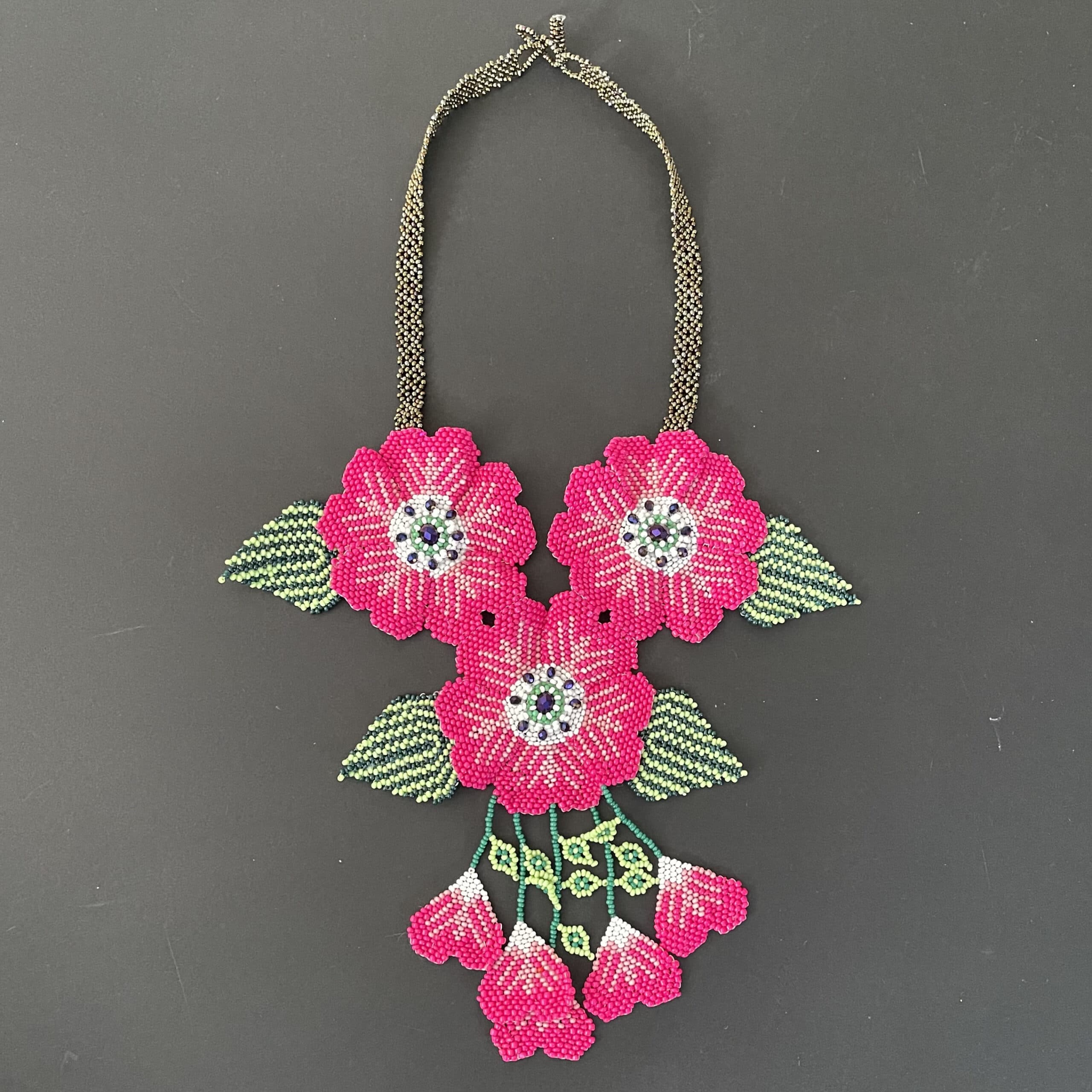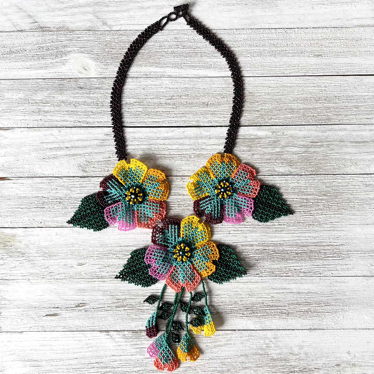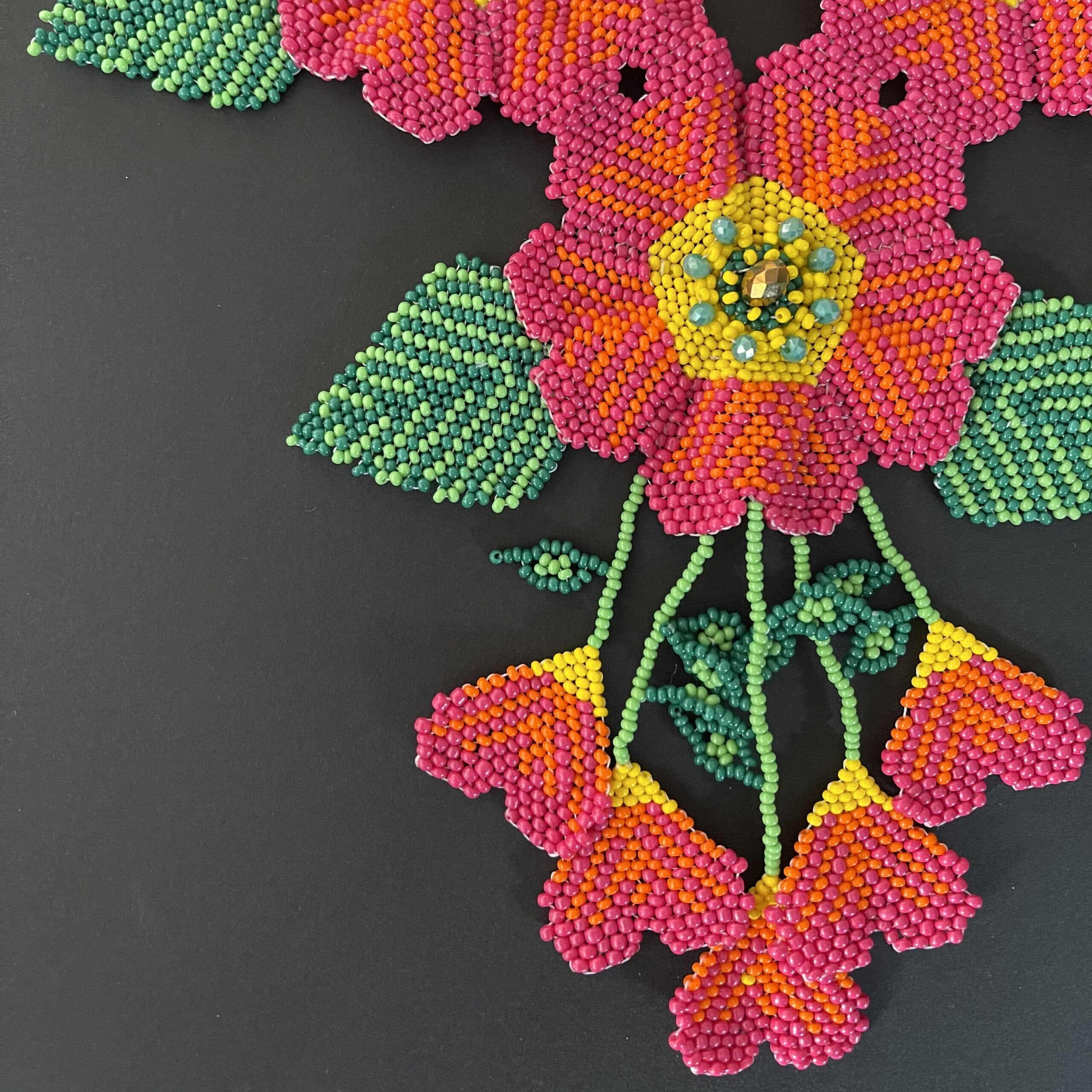 Completo collana orecchini e bracciale Huichol, tecnica di lavorazione: le chaquiras multicolore (perline di vetro) vengono intrecciate una ad una fino a completare i disegni degli accessori; Nella sua elaborazione l’artista Huichol sviluppa forme e disegni con simboli rappresentativi della sua cultura e tradizione.