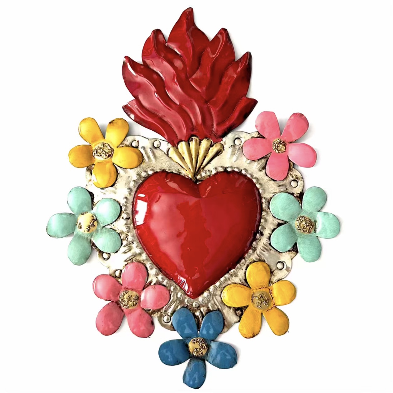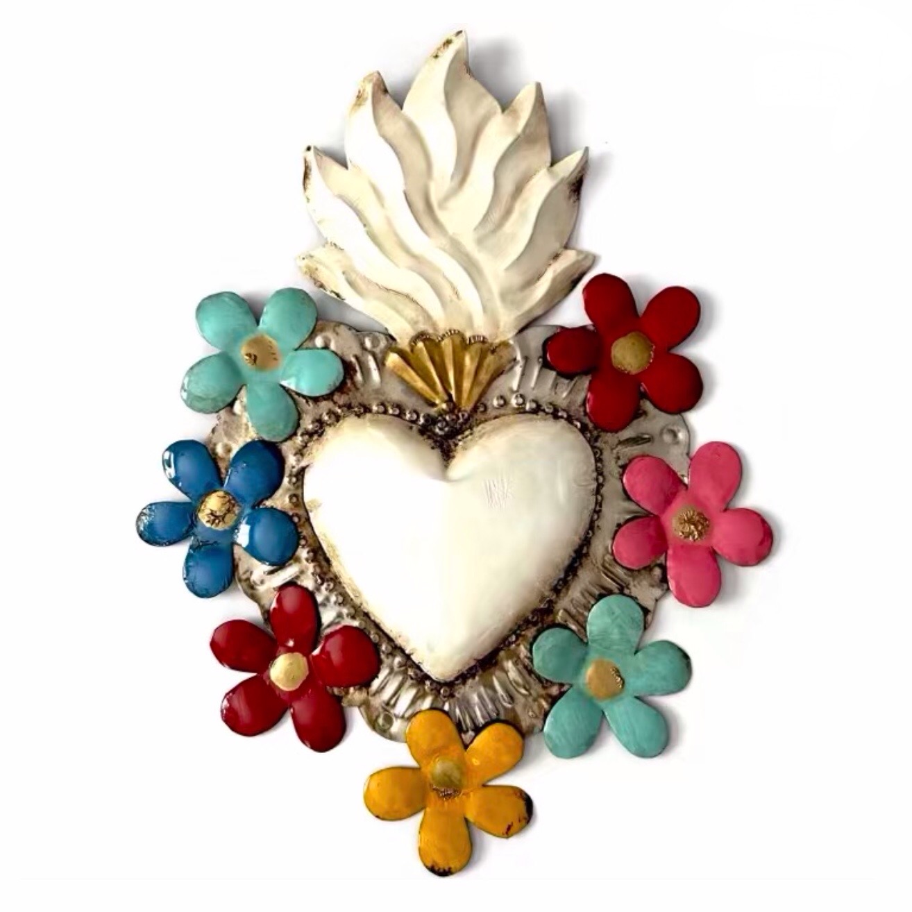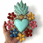 Decora la tua casa con un complemento d’arredo di artigianato messicano. Il cuore sacro è in metallo leggero e completamente realizzato a mano da artigiani della zona di Guanajuato. Questo complemento d’arredo può essere posizionato su una superficie piatta come un tavolino o una mensola oppure appeso al muro grazie al gancio posteriore.