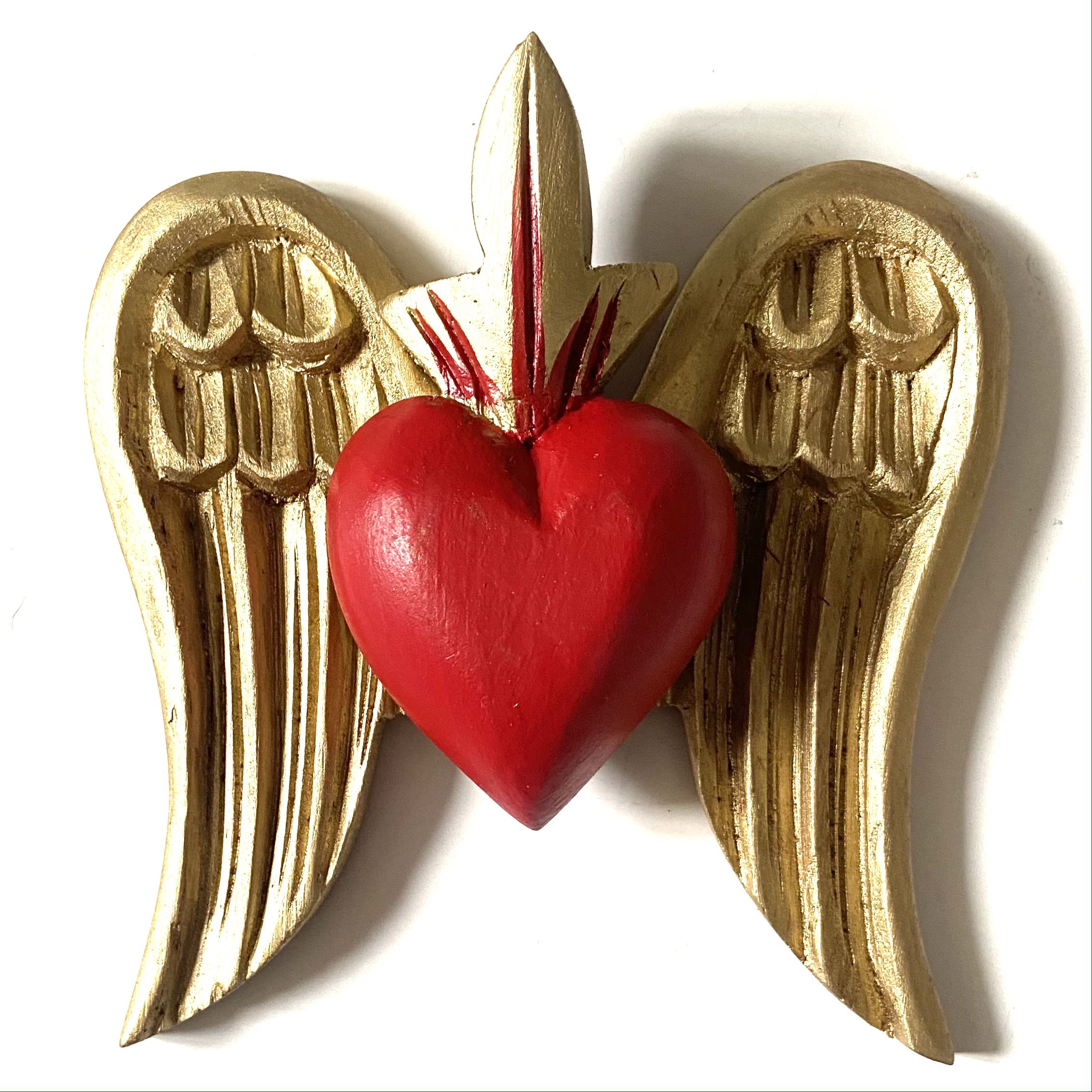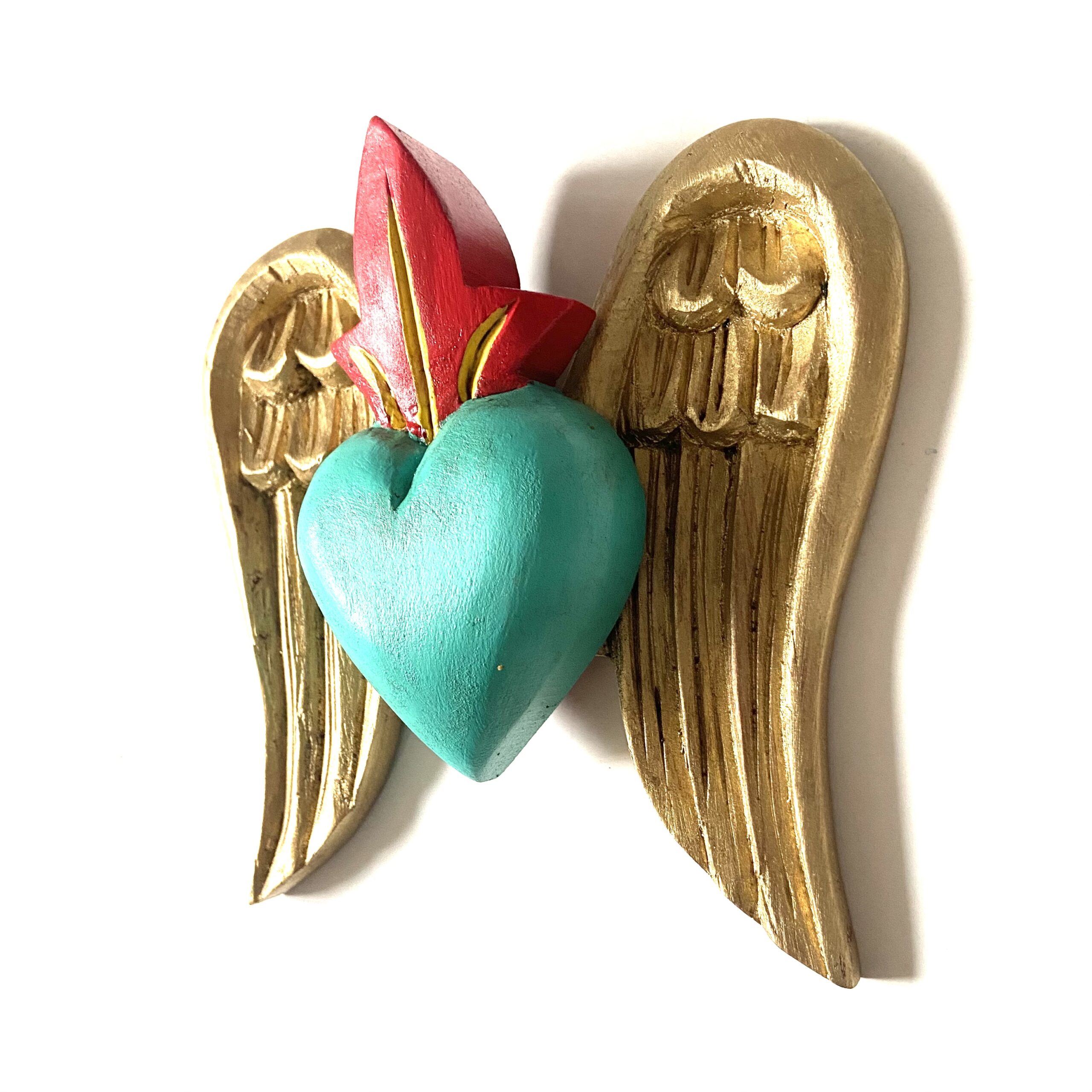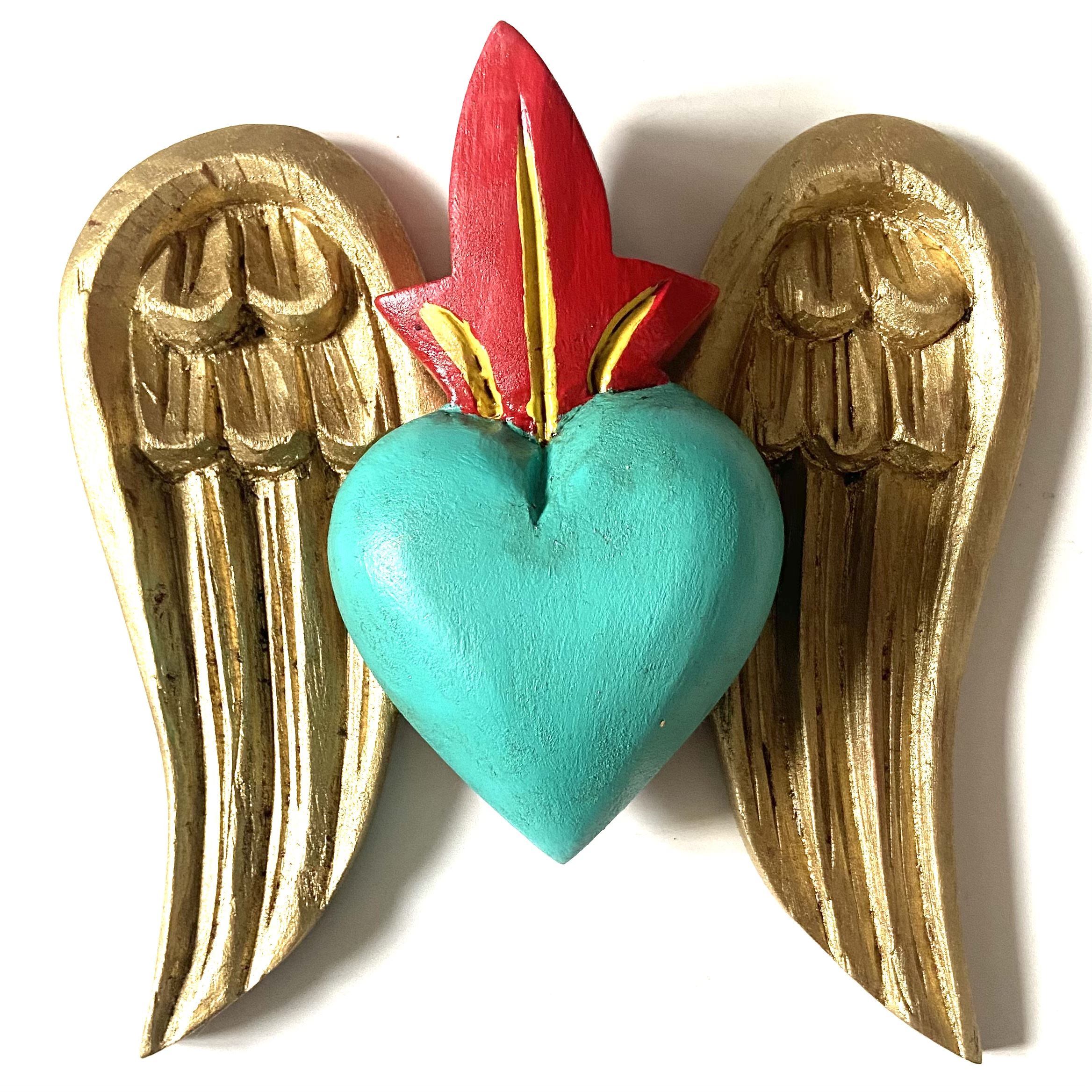 Il cuore con ali è un oggetto decorativo realizzato in legno proveniente della zona di Michoacán, è intagliato e dipinto a mano da esperti artigiani. Questo complemento d’arredo può essere posizionato su una superficie piatta come un tavolino o una mensola oppure appeso al muro grazie al gancio posteriore.