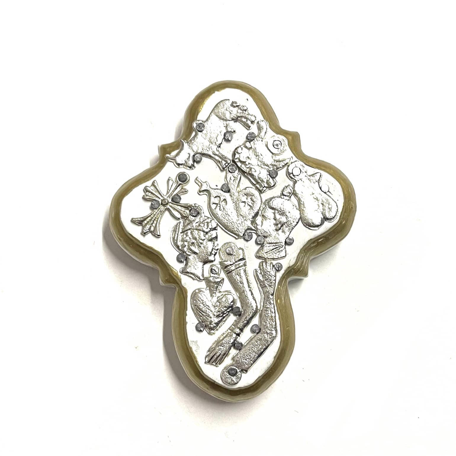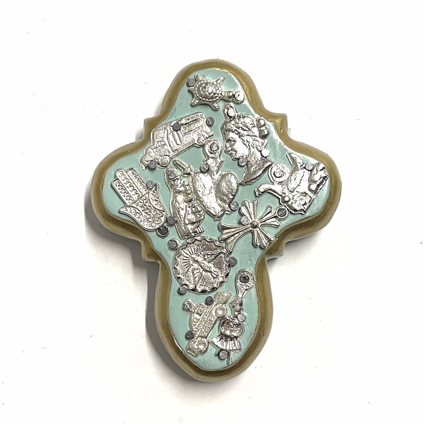 La croce è un oggetto decorativo realizzato in legno proveniente della zona di Michoacán. I miracoli sono simili a quelli italiani conosciuti come ex voto, che appunto, vengono offerti alle divinità per grazia ricevuta o in adempimento di una promessa. La croce è intagliata e dipinto a mano inoltre i miracoli in metallo sono posizionati uno a uno da esperti artigiani Questo complemento d’arredo può essere posizionato su una superficie piatta come un tavolino o una mensola oppure appeso al muro grazie al gancio posteriore.