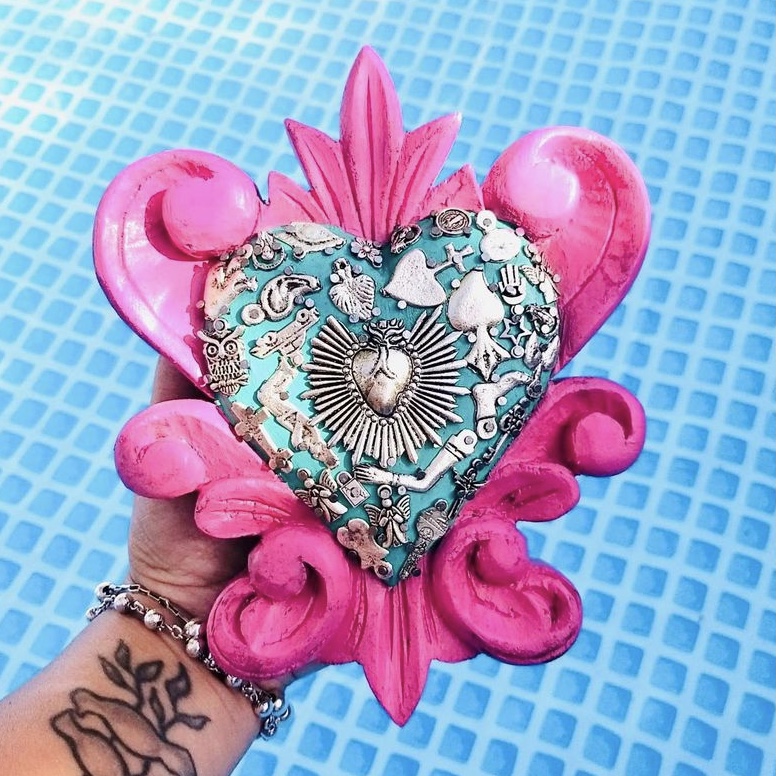 Il Sacro cuore con miracoli è un oggetto decorativo realizzato in legno proveniente della zona di Michoacán. Questi oggetti sono simili a quelli italiani conosciuti come ex voto, che appunto, vengono offerti alle divinità per grazia ricevuta o in adempimento di una promessa. Il sacro cuore è intagliato e dipinto a mano inoltre i miracoli in metallo sono posizionati uno a uno da esperti artigiani Questo complemento d’arredo può essere posizionato su una superficie piatta come un tavolino o una mensola oppure appeso al muro grazie al gancio posteriore.