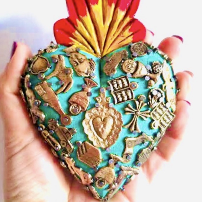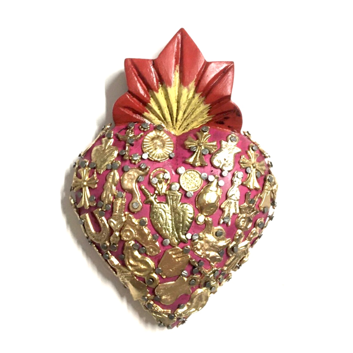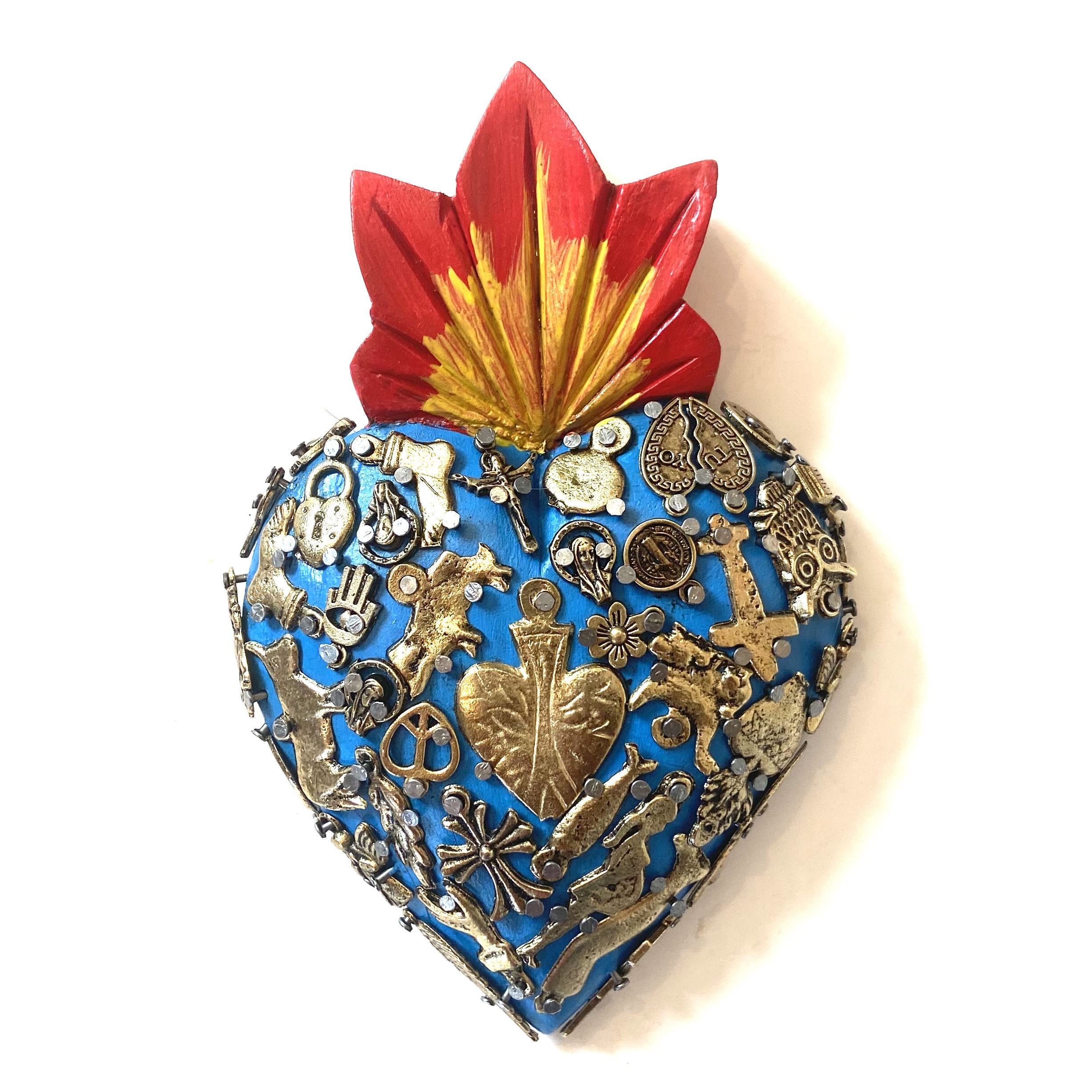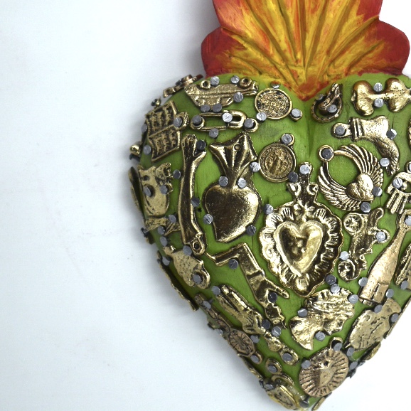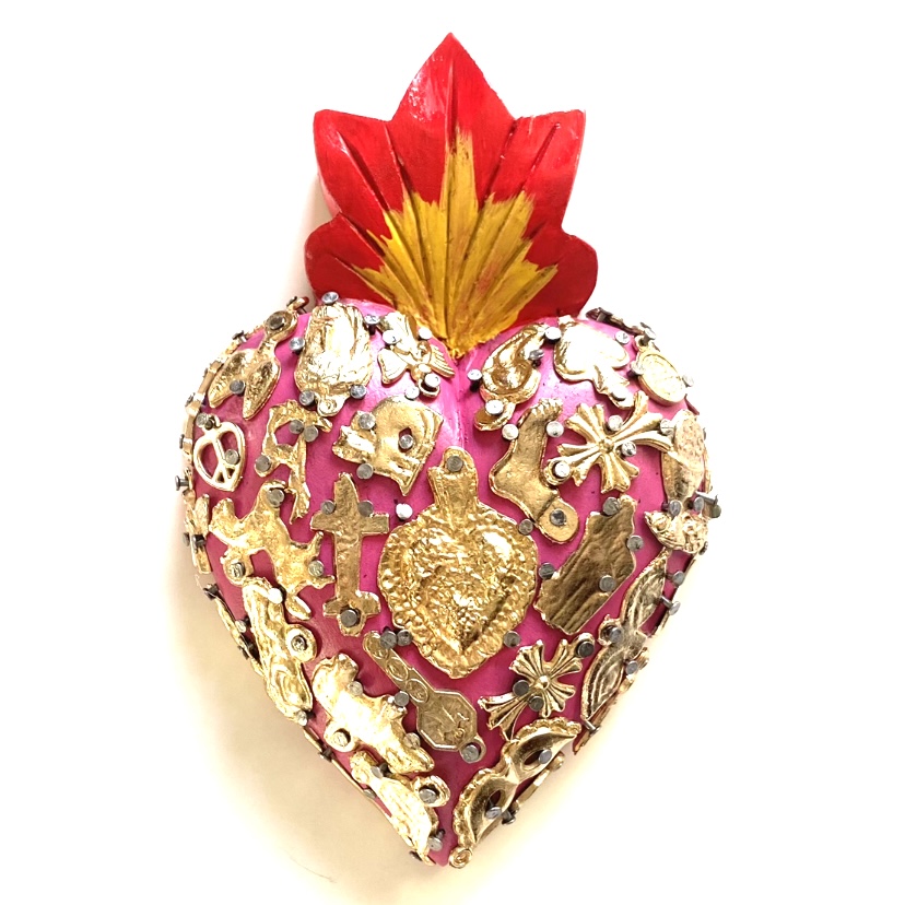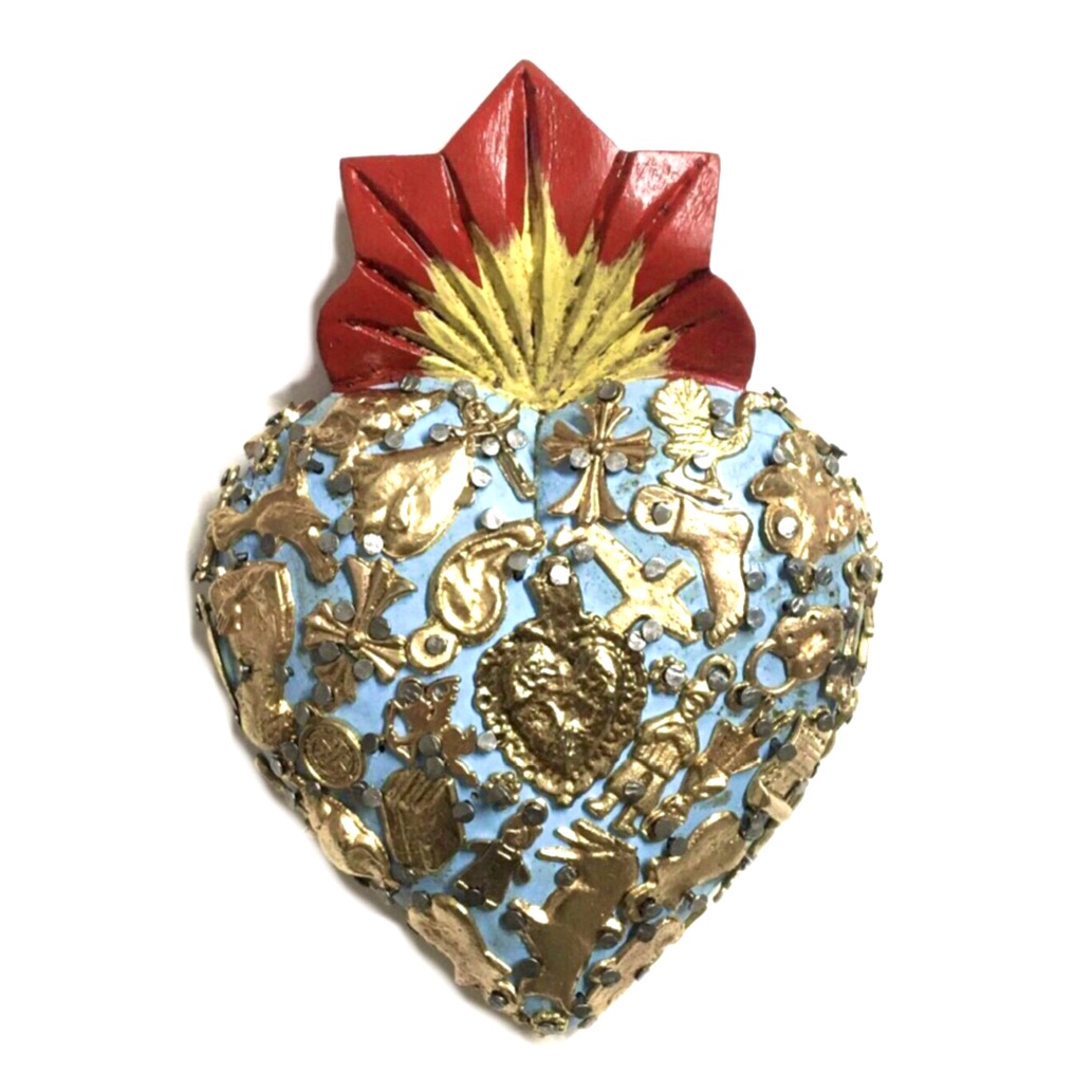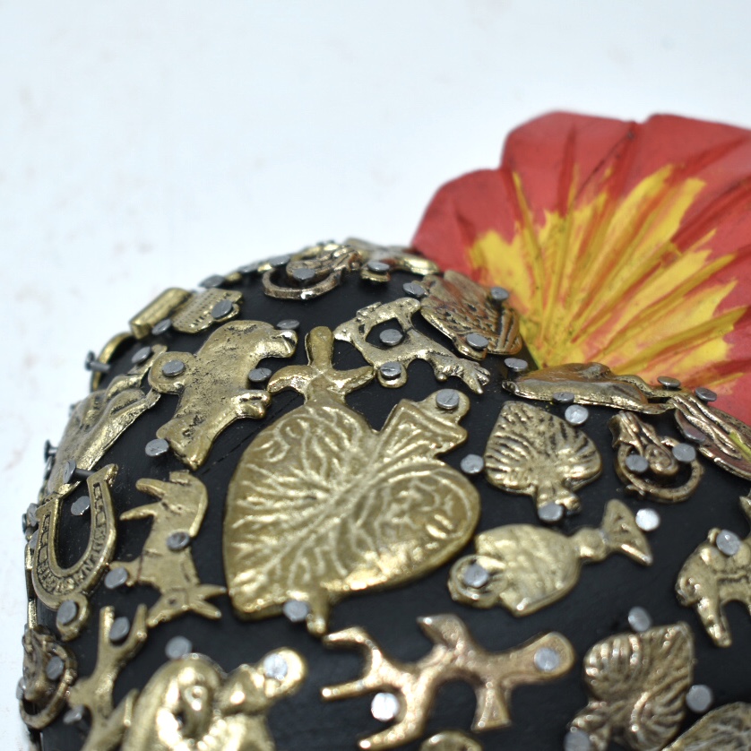 Il Sacro cuore con miracoli è un oggetto decorativo realizzato in legno proveniente della zona di Michoacán. Questi oggetti sono simili a quelli italiani conosciuti come ex voto, che appunto, vengono offerti alle divinità per grazia ricevuta o in adempimento di una promessa. Il sacro cuore è intagliato e dipinto a mano inoltre i miracoli in metallo sono posizionati uno a uno da esperti artigiani Questo complemento d’arredo può essere posizionato su una superficie piatta come un tavolino o una mensola oppure appeso al muro grazie al gancio posteriore.
