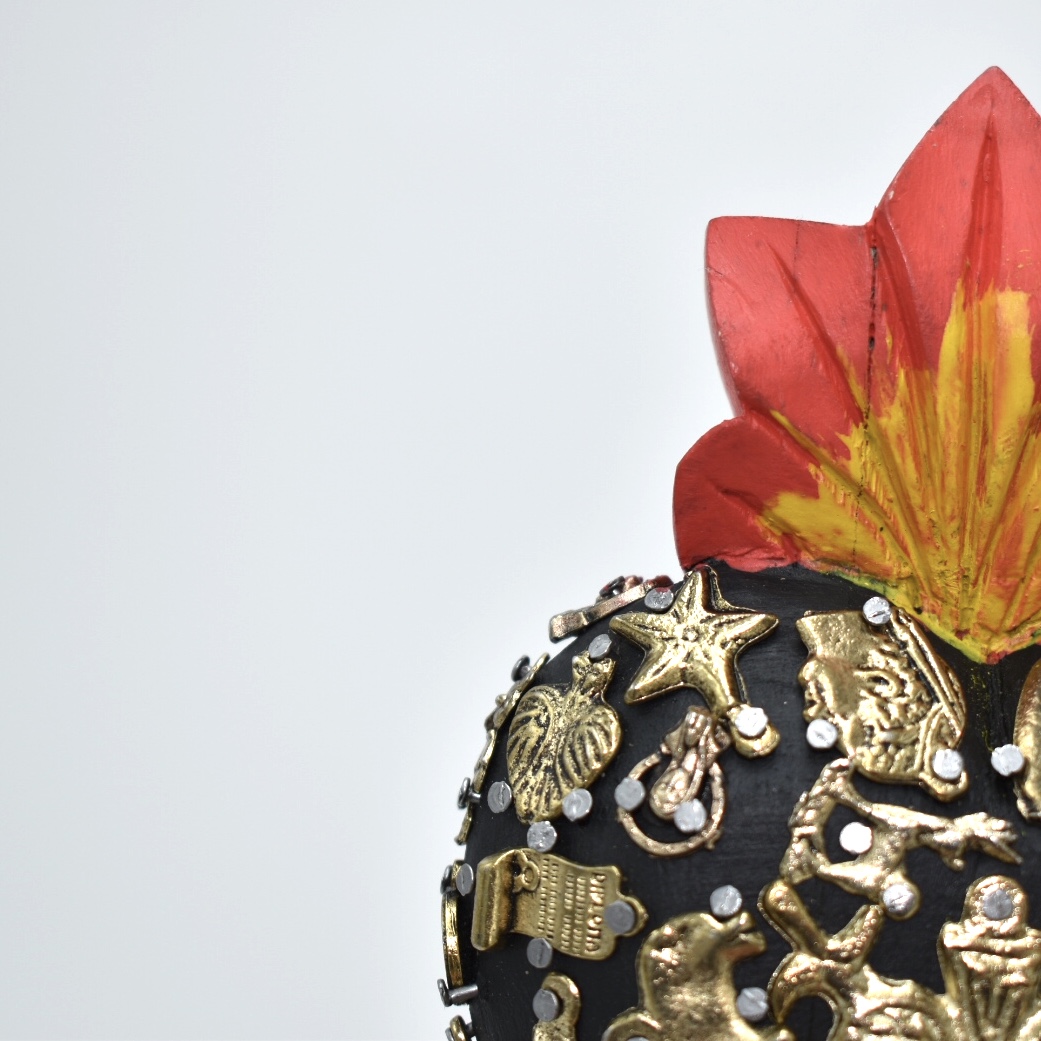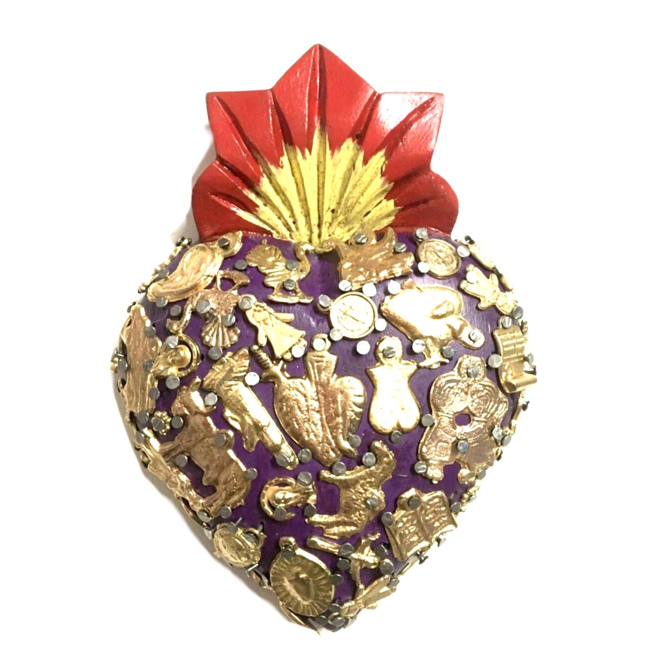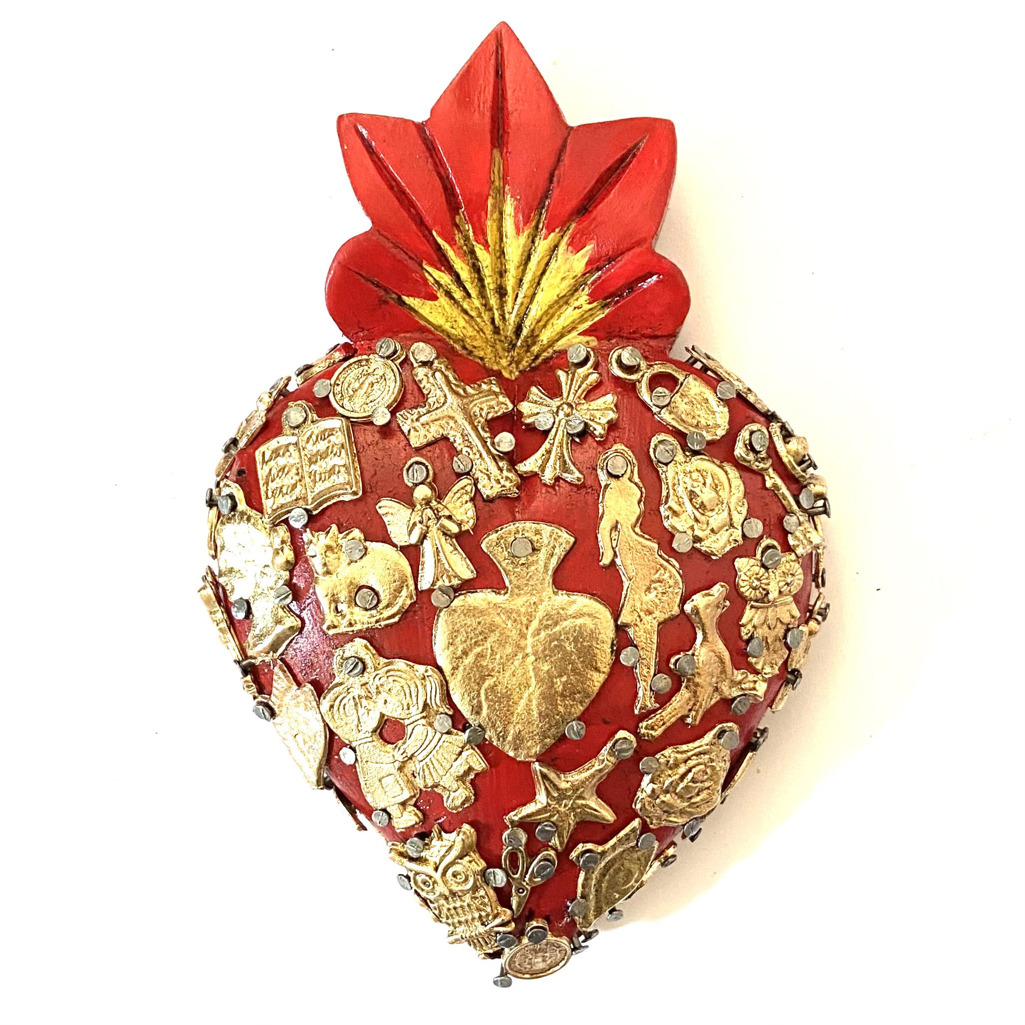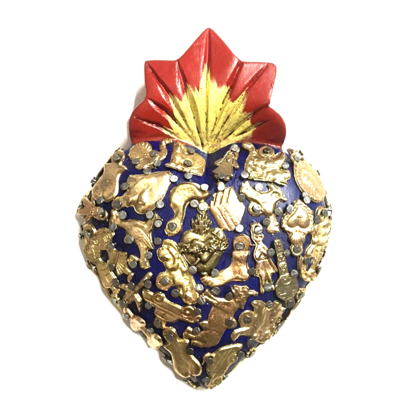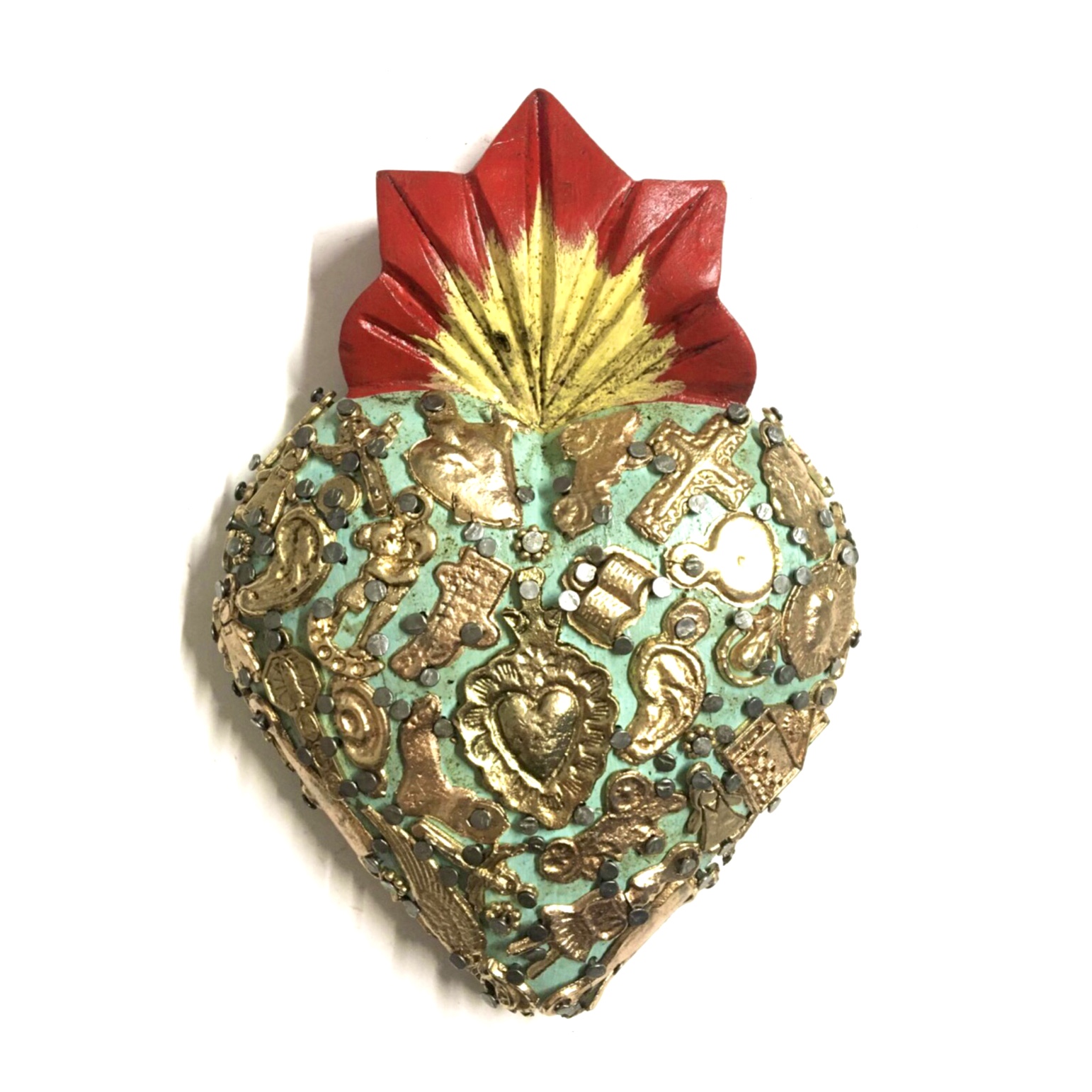Il Sacro cuore con miracoli è un oggetto decorativo realizzato in legno proveniente della zona di Michoacán. Questi oggetti sono simili a quelli italiani conosciuti come ex voto, che appunto, vengono offerti alle divinità per grazia ricevuta o in adempimento di una promessa. Il sacro cuore è intagliato e dipinto a mano inoltre i miracoli in metallo sono posizionati uno a uno da esperti artigiani Questo complemento d’arredo può essere posizionato su una superficie piatta come un tavolino o una mensola oppure appeso al muro grazie al gancio posteriore.