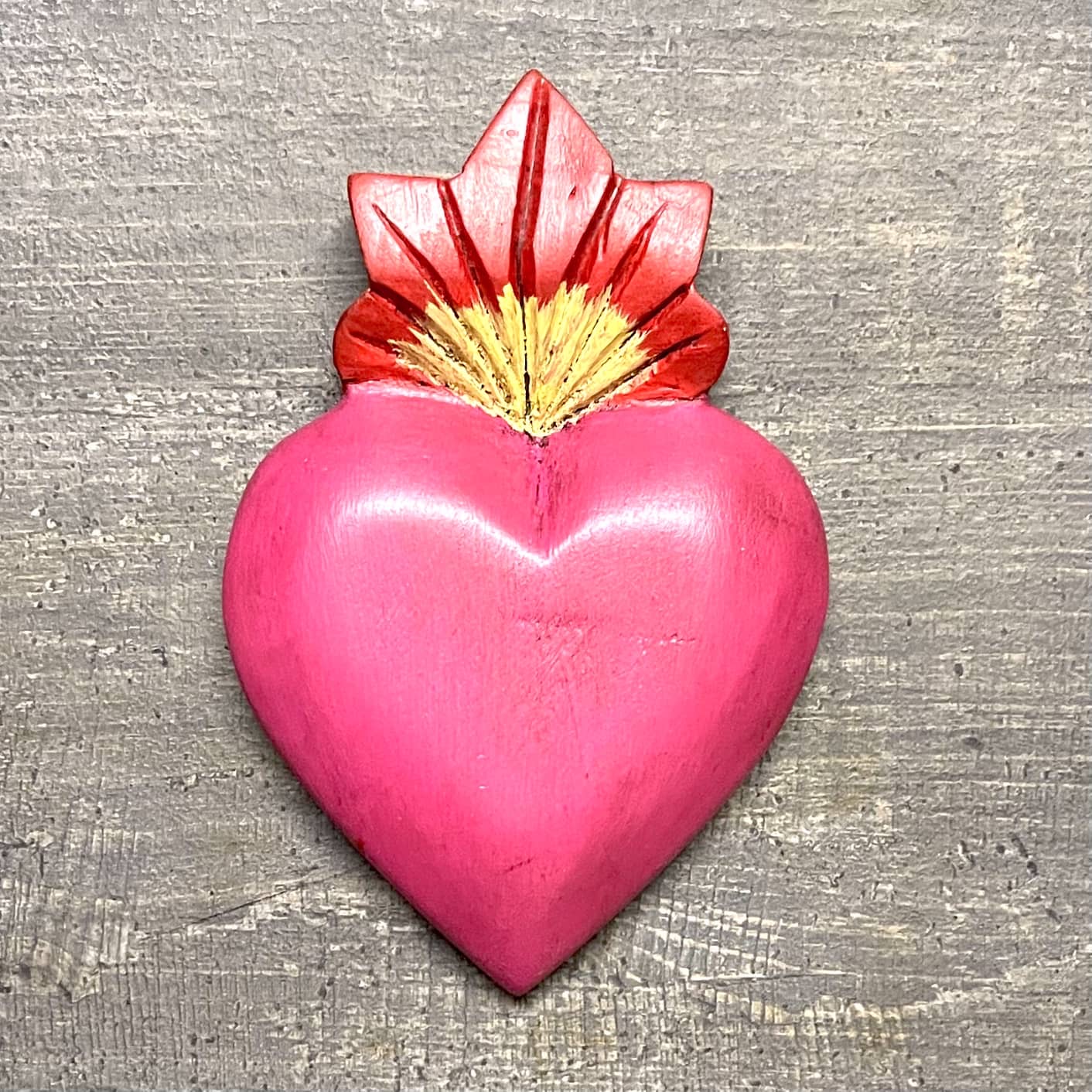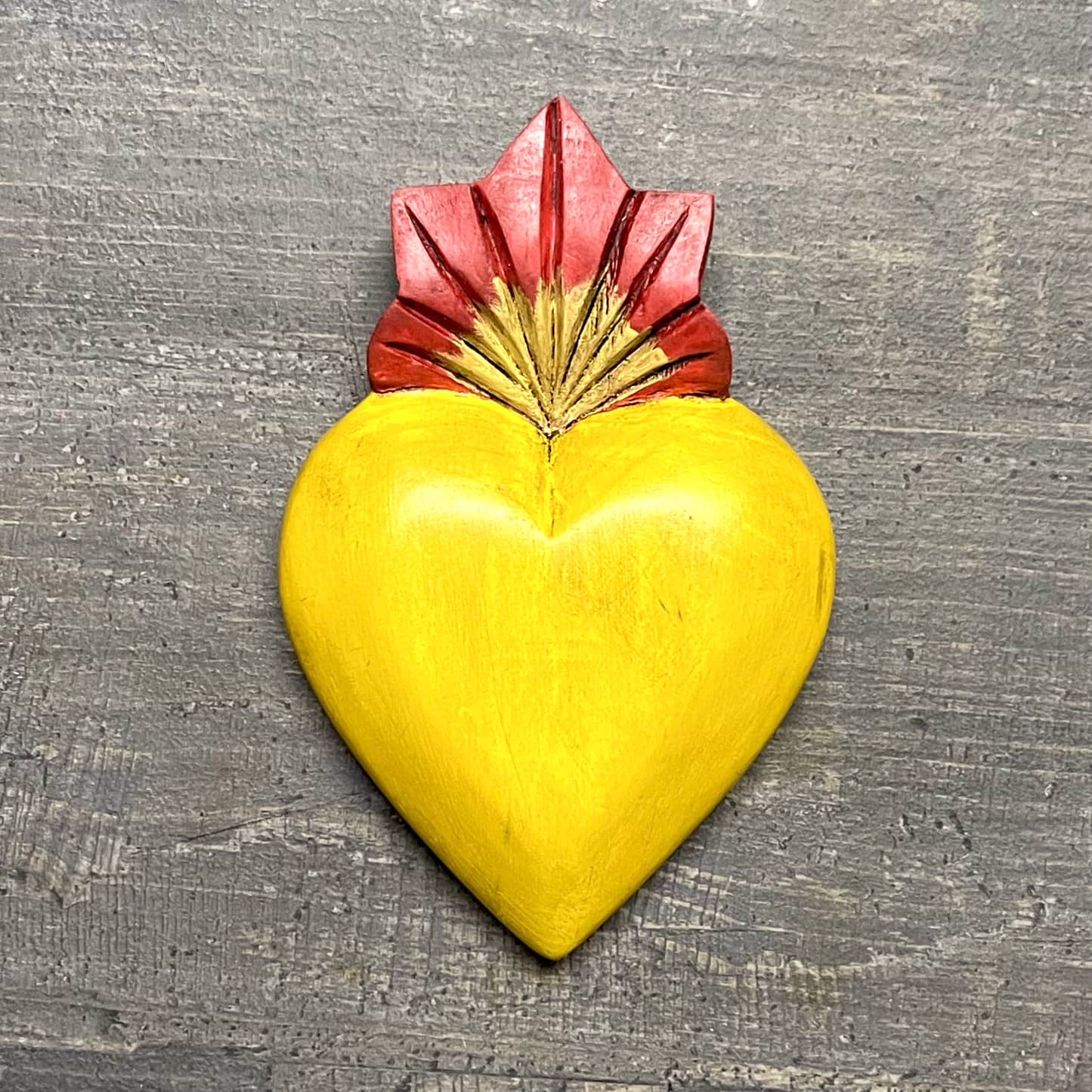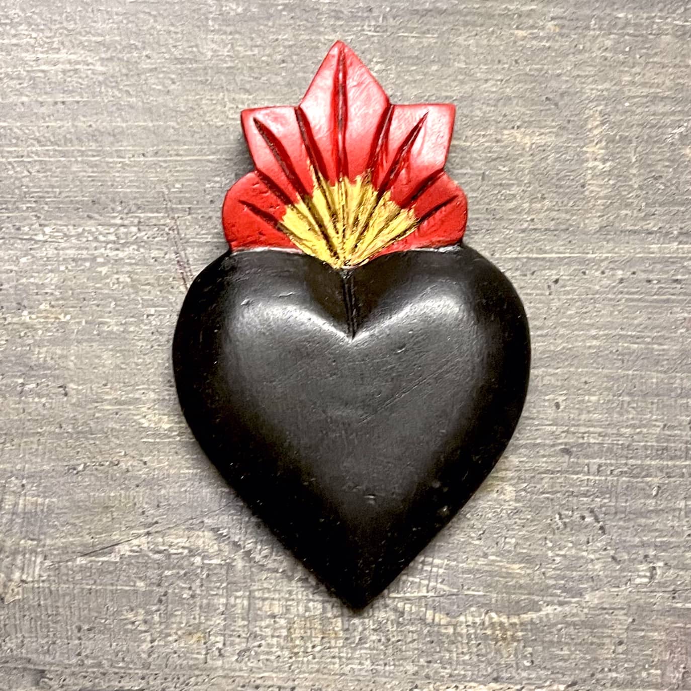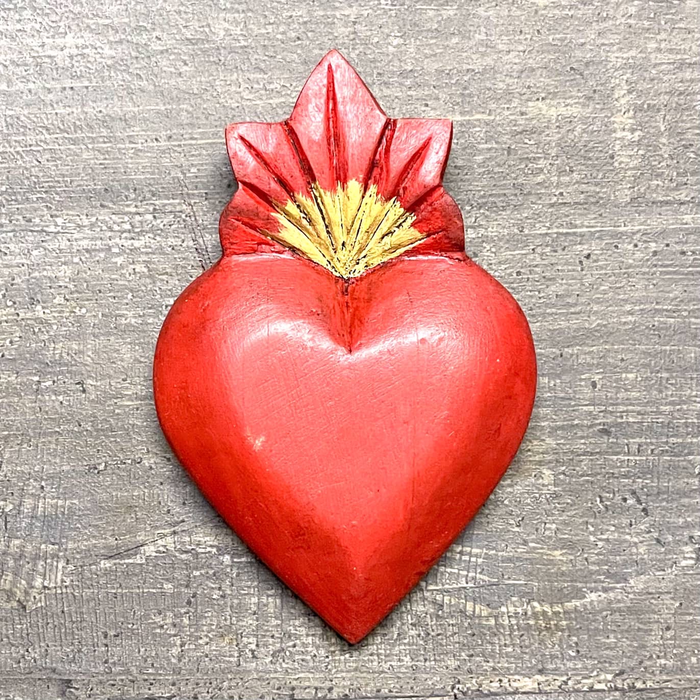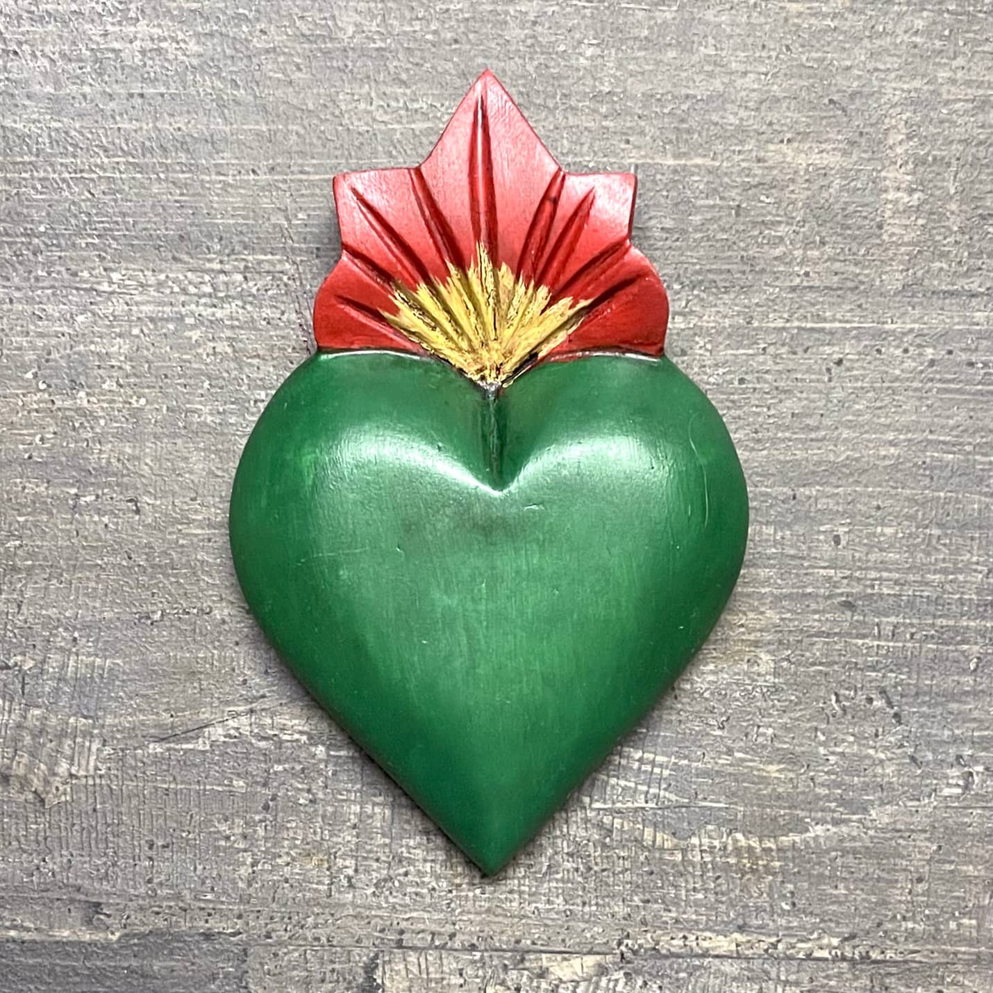 Il Sacro cuore con miracoli è un oggetto decorativo realizzato in legno proveniente della zona di Michoacán. Questi oggetti sono simili a quelli italiani conosciuti come ex voto, che appunto, vengono offerti alle divinità per grazia ricevuta o in adempimento di una promessa. Il sacro cuore è intagliato e dipinto a mano da esperti artigiani Questo complemento d’arredo può essere posizionato su una superficie piatta come un tavolino o una mensola oppure appeso al muro grazie al gancio posteriore.