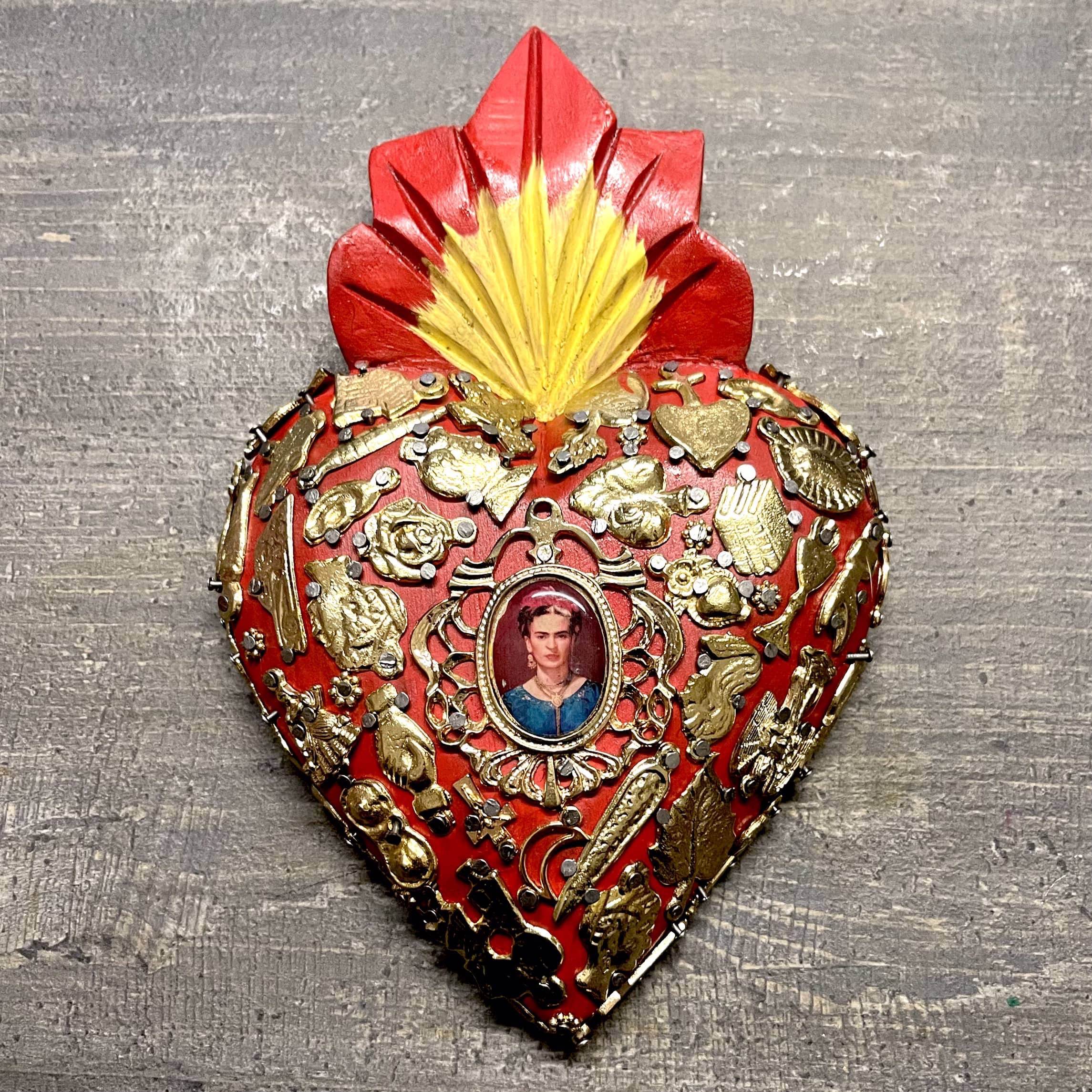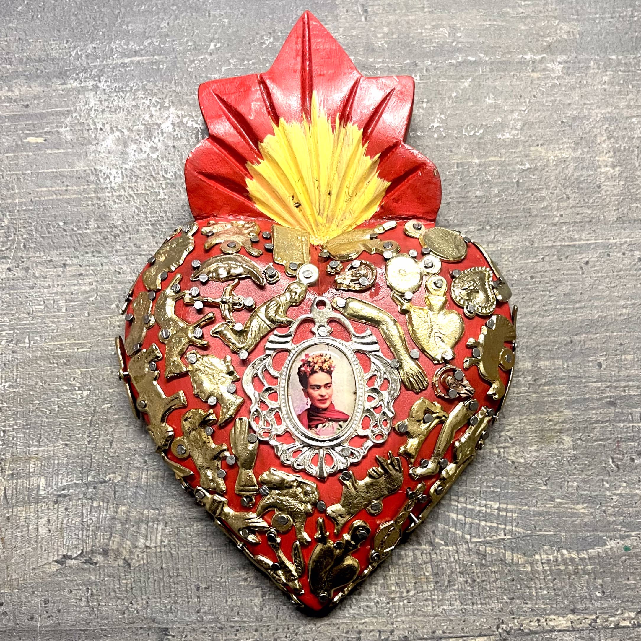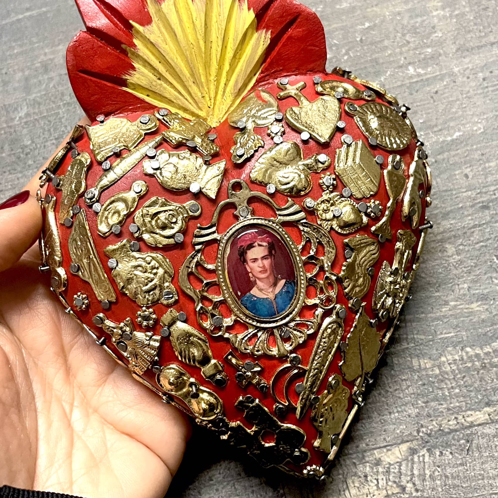 Il Sacro cuore con miracoli è un oggetto decorativo realizzato in legno proveniente della zona di Michoacán. Questi oggetti sono simili a quelli italiani conosciuti come ex voto, che appunto, vengono offerti alle divinità per grazia ricevuta o in adempimento di una promessa. Il sacro cuore è intagliato e dipinto a mano inoltre i miracoli in metallo sono posizionati uno a uno da esperti artigiani Questo complemento d’arredo può essere posizionato su una superficie piatta come un tavolino o una mensola oppure appeso al muro grazie al gancio posteriore.