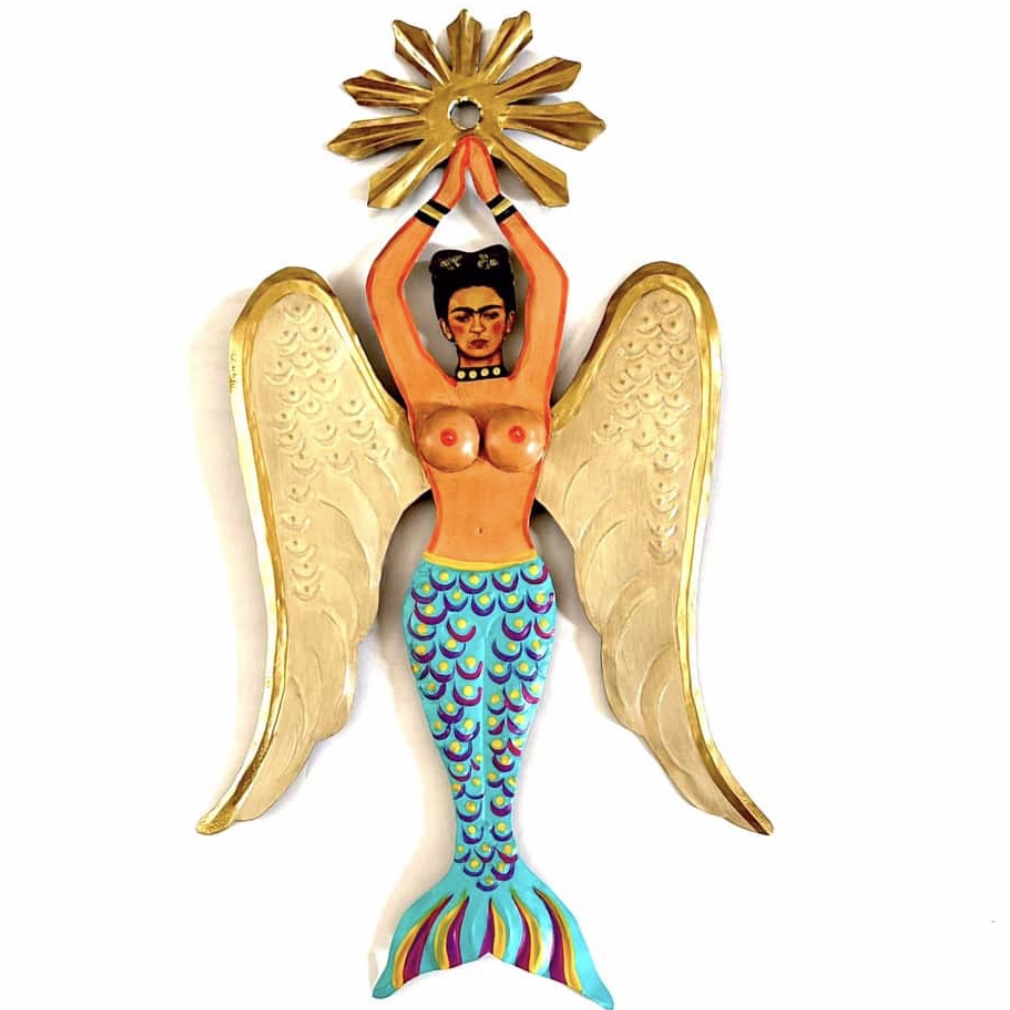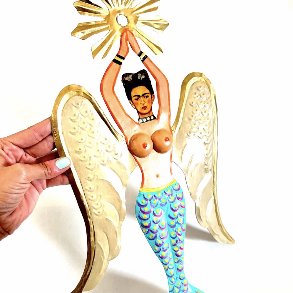 Decora la tua casa con un complemento d’arredo di artigianato messicano. La sirena Frida è in metallo leggero e completamente realizzato a mano da artigiani della zona di Guanajuato. Questo complemento d’arredo può essere posizionato su una superficie piatta come un tavolino o una mensola oppure appeso al muro grazie al gancio posteriore.