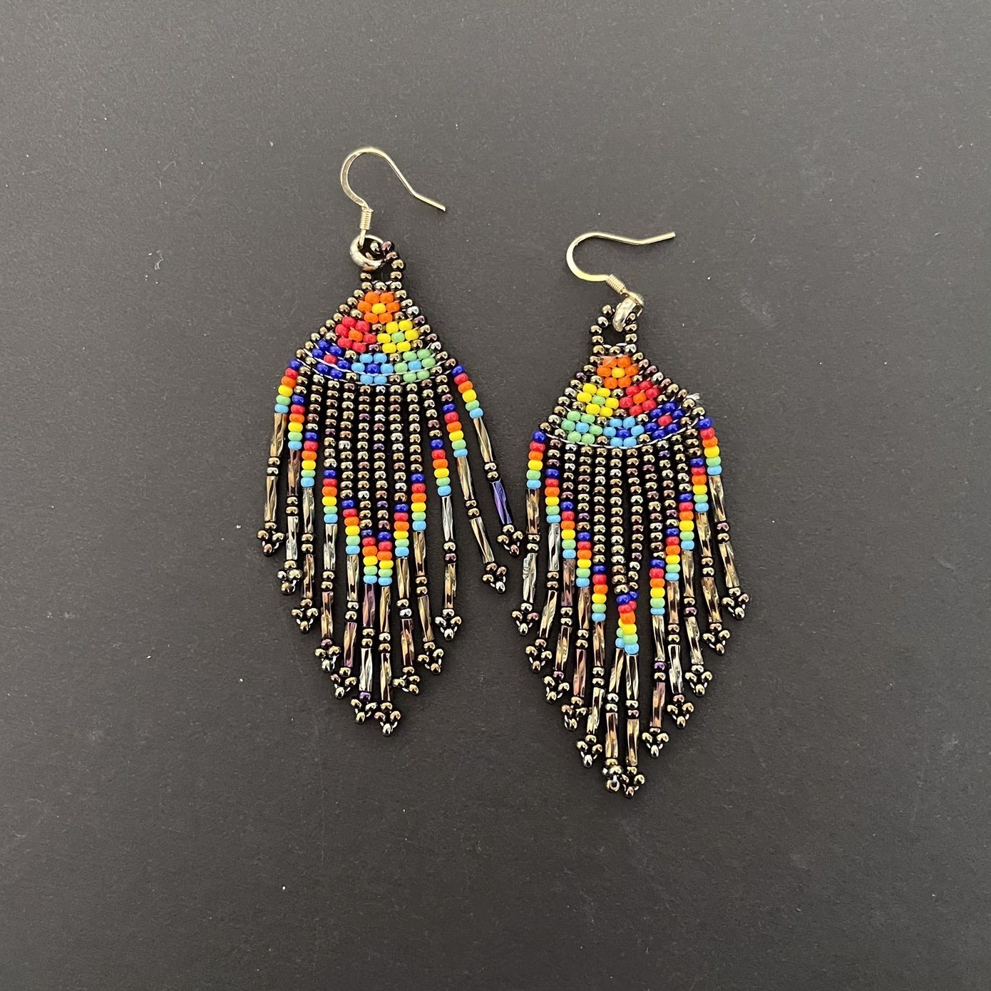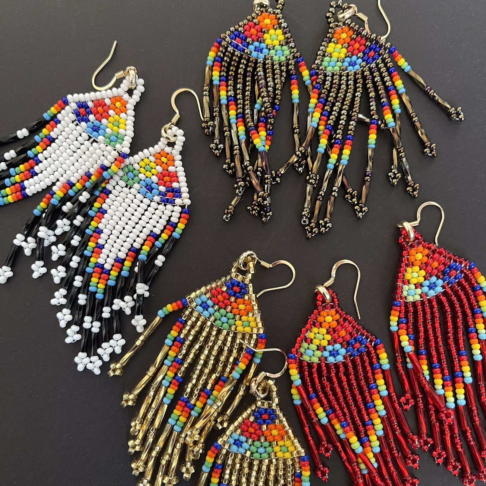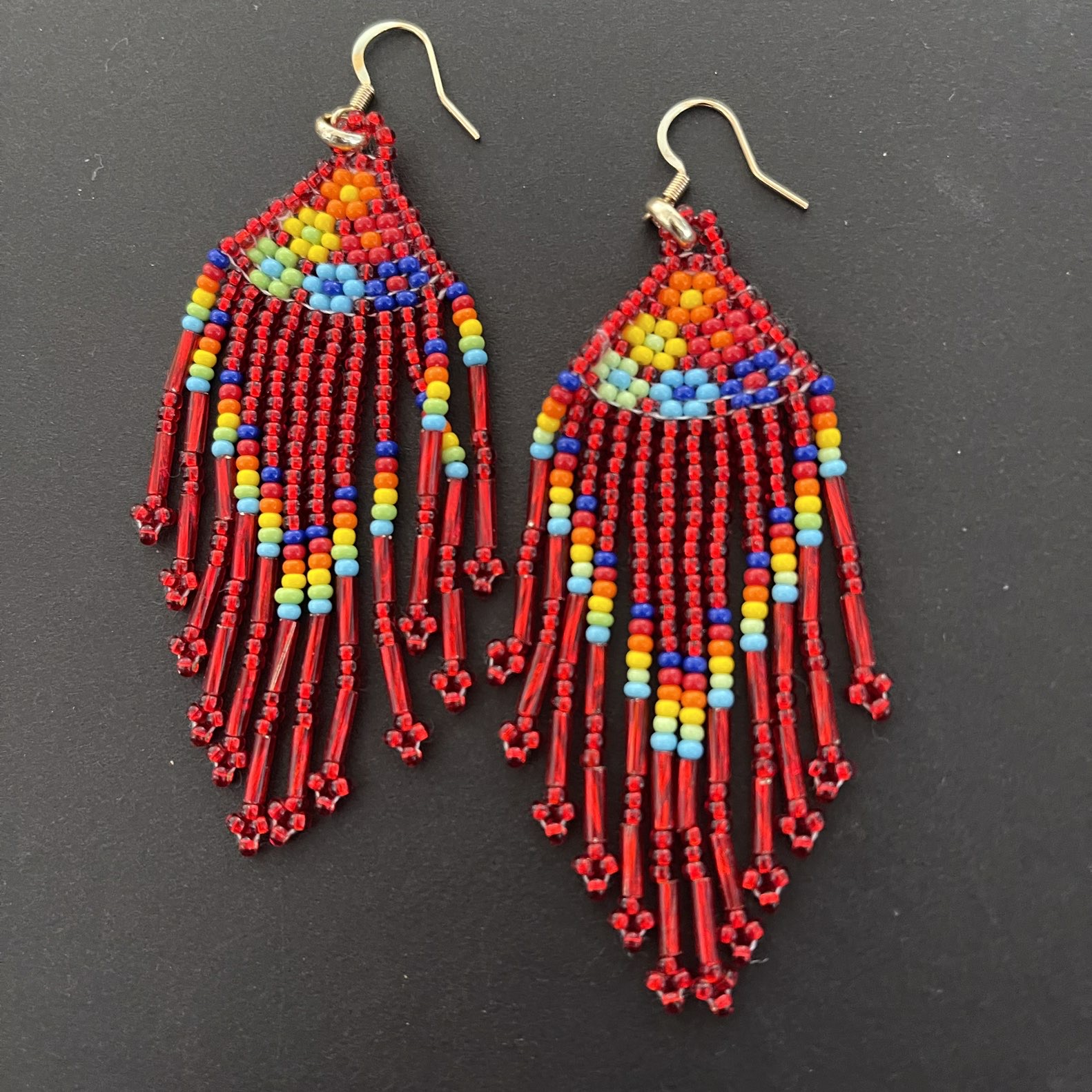 Orecchini Huichol, tecnica di lavorazione: le chaquiras multicolore (perline di vetro) vengono intrecciate una ad una fino a completare i disegni degli accessori; Nella sua elaborazione l’artista Huichol sviluppa forme e disegni con simboli rappresentativi della sua cultura e tradizione.