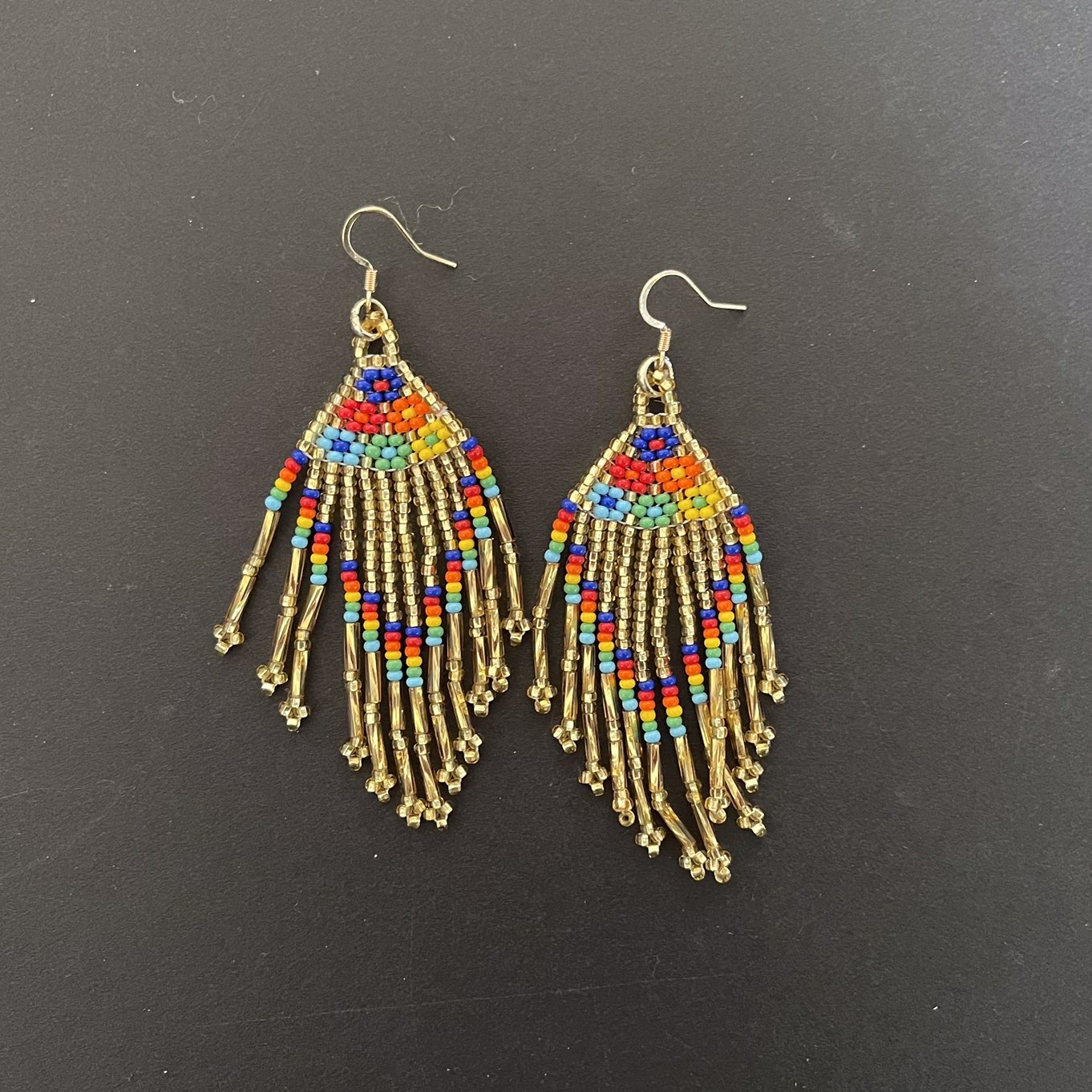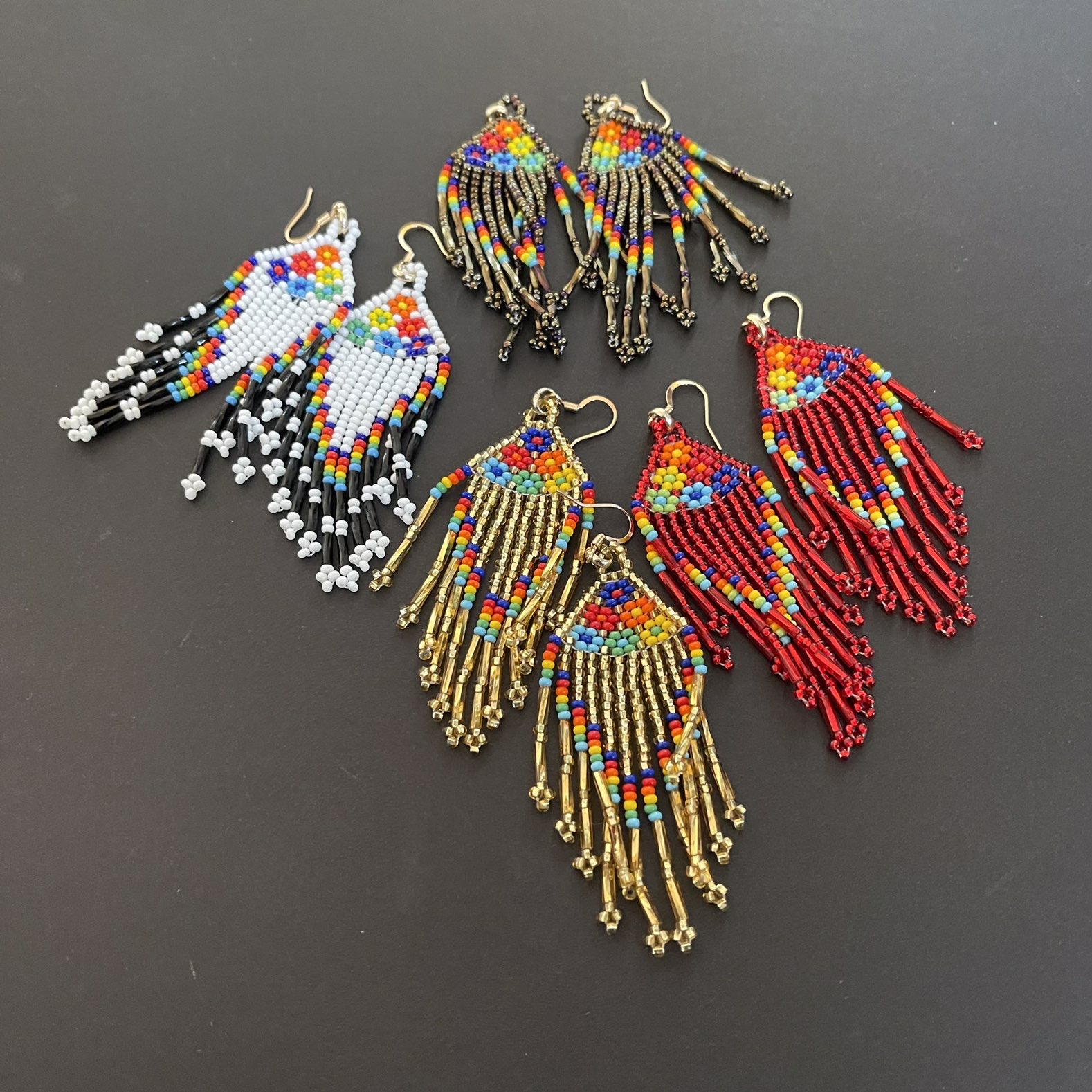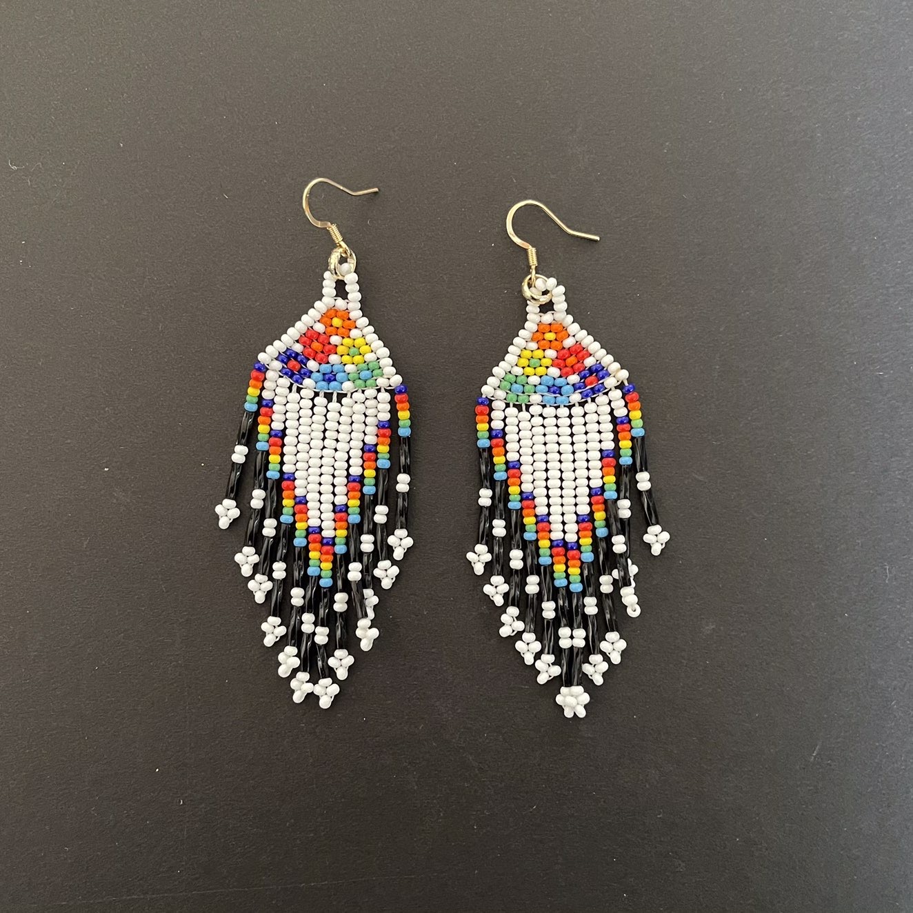 Orecchini Huichol, tecnica di lavorazione: le chaquiras multicolore (perline di vetro) vengono intrecciate una ad una fino a completare i disegni degli accessori; Nella sua elaborazione l’artista Huichol sviluppa forme e disegni con simboli rappresentativi della sua cultura e tradizione.