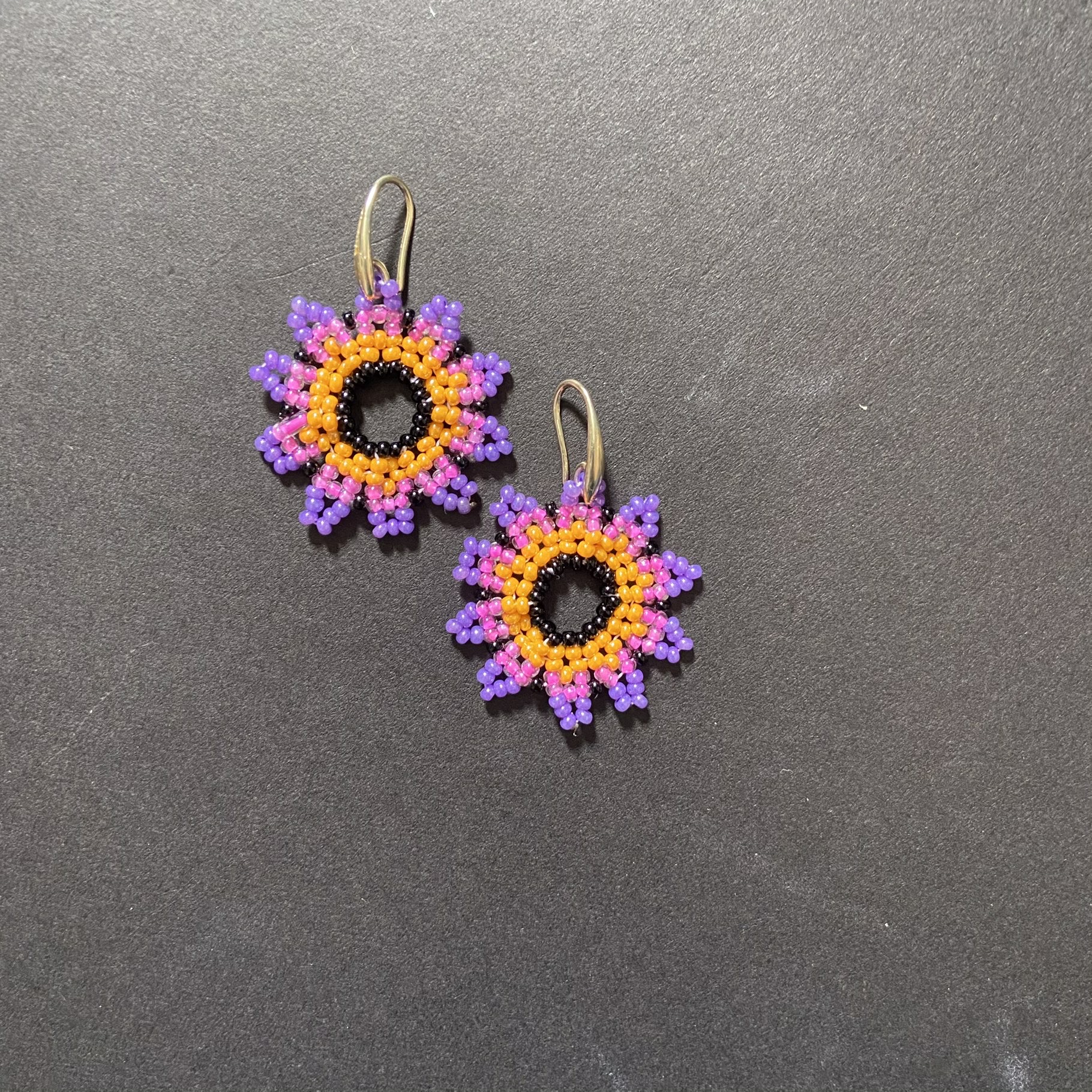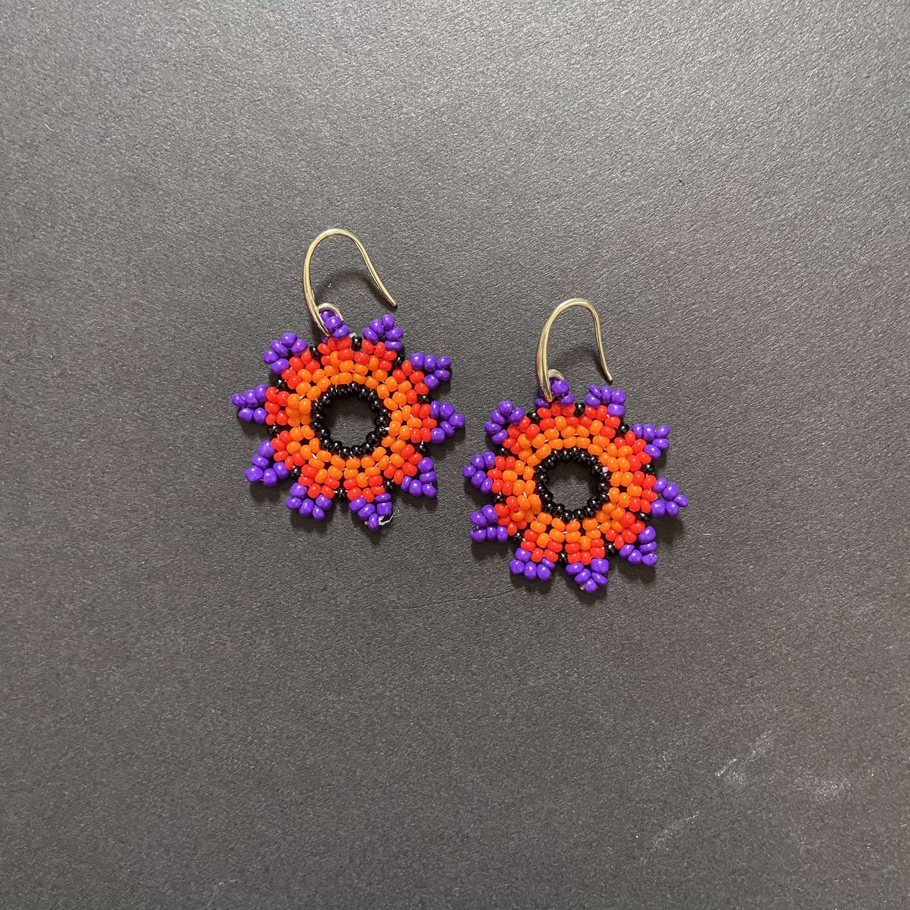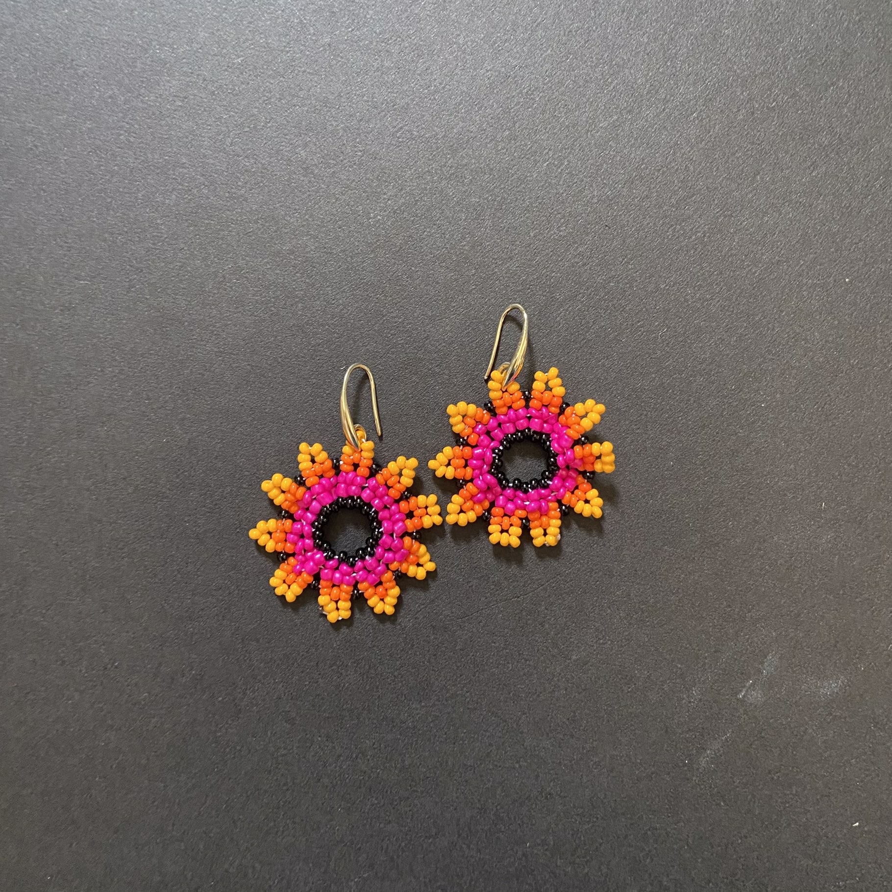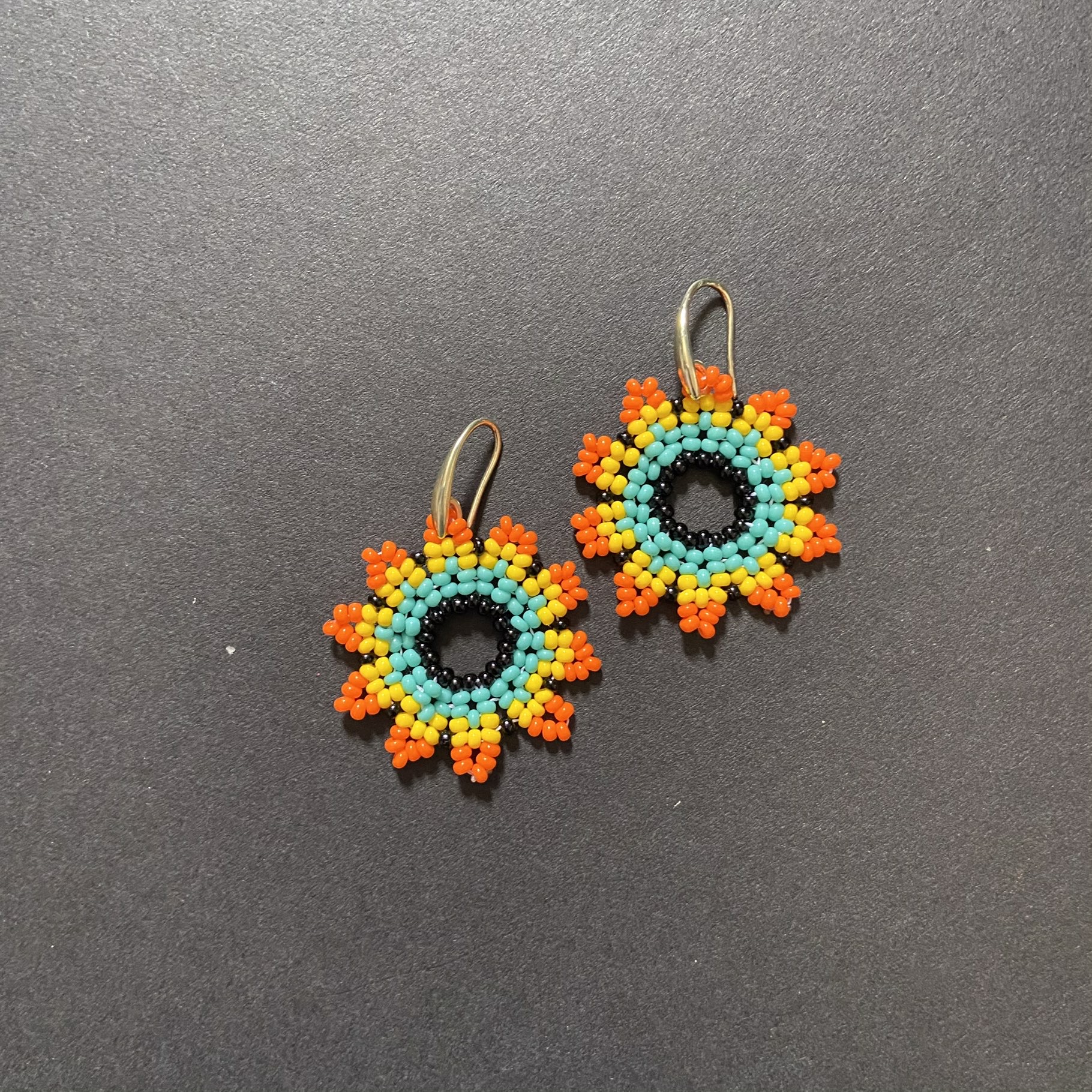 Orecchini girasole Huichol, tecnica di lavorazione: le chaquiras multicolore (perline di vetro) vengono intrecciate una ad una fino a completare i disegni degli accessori; Nella sua elaborazione l’artista Huichol sviluppa forme e disegni con simboli rappresentativi della sua cultura e tradizione.