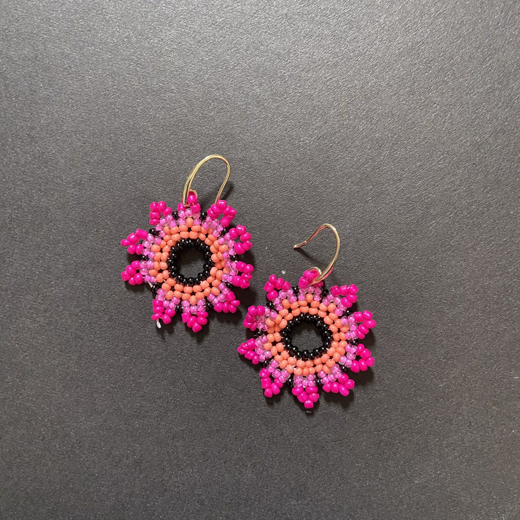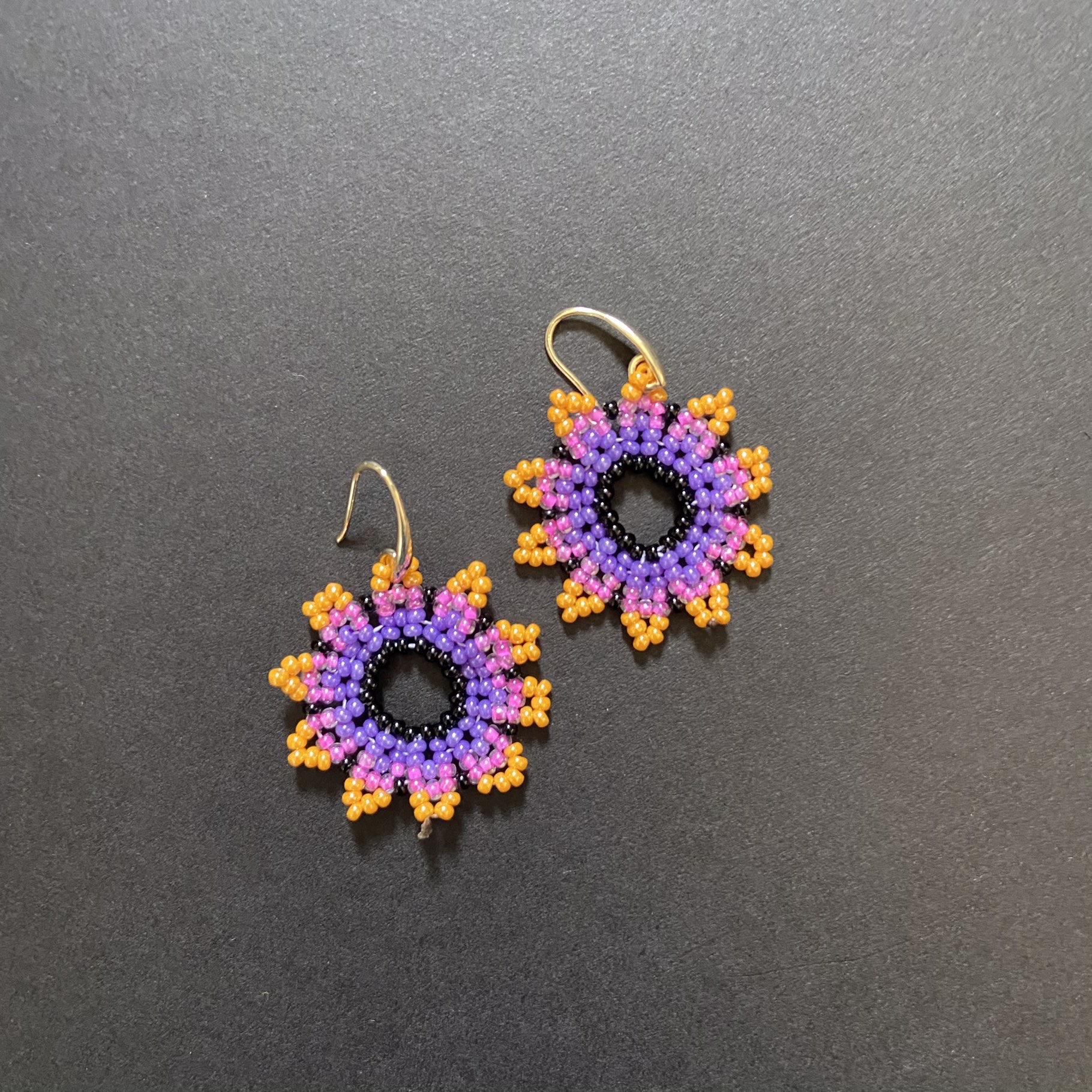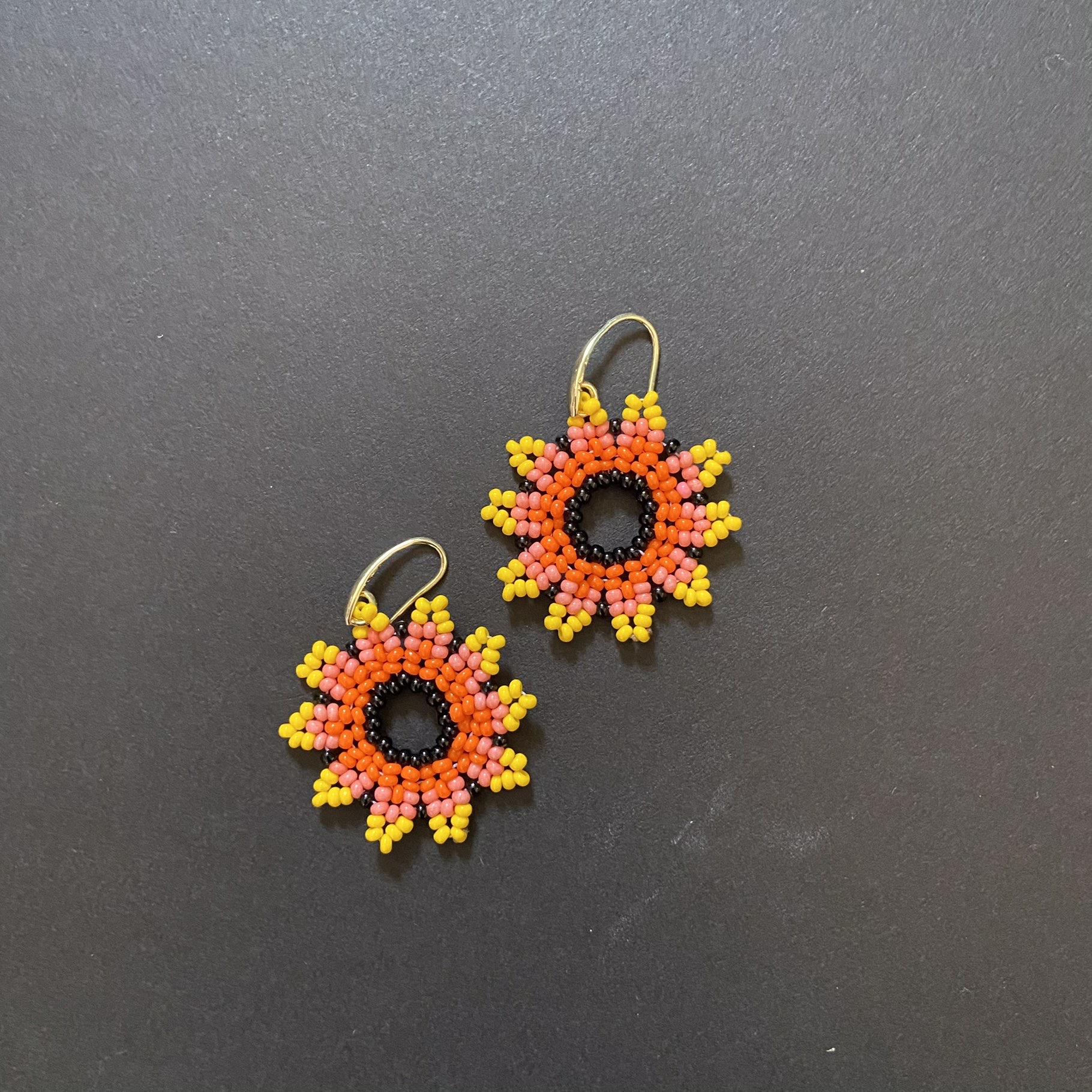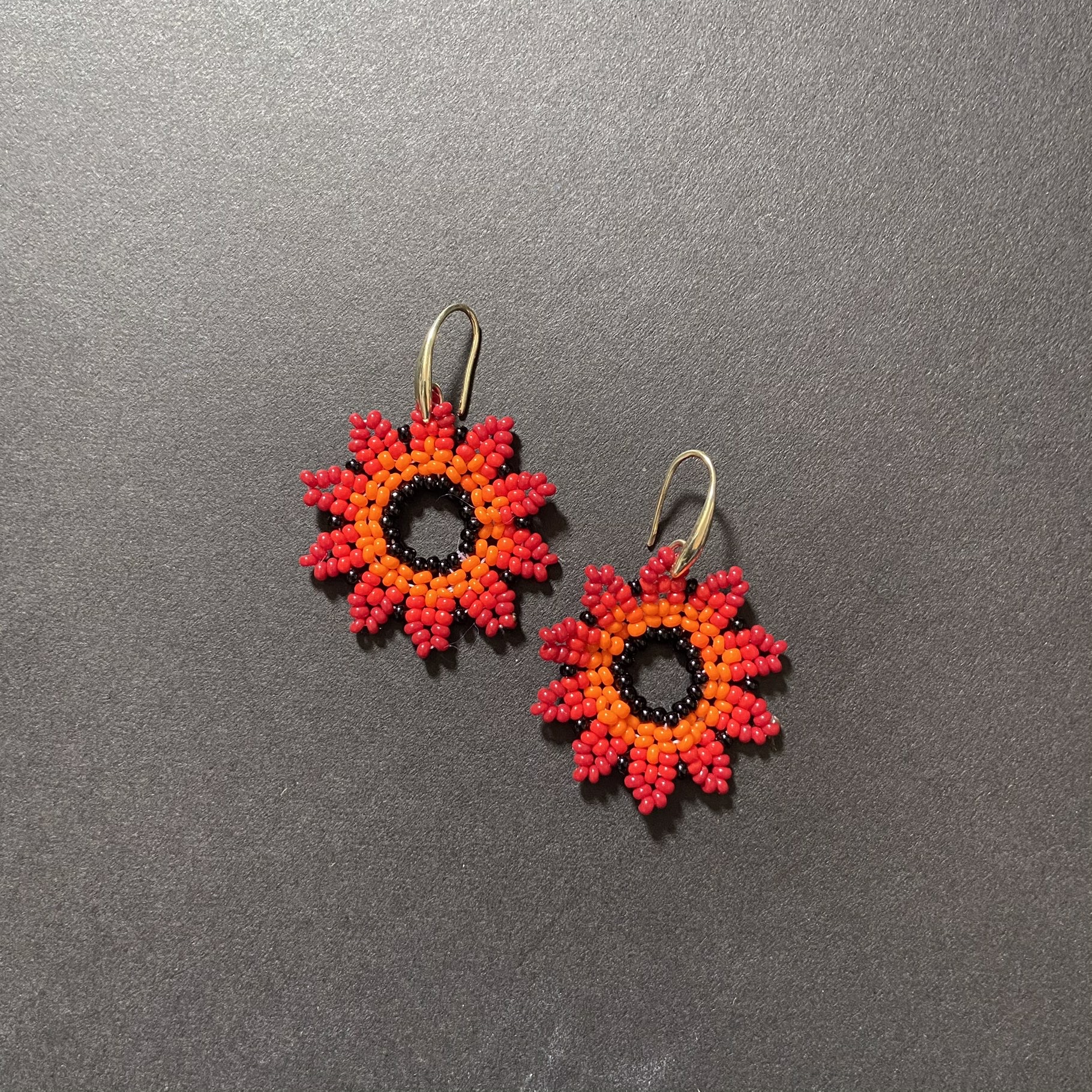 Orecchini girasole Huichol, tecnica di lavorazione: le chaquiras multicolore (perline di vetro) vengono intrecciate una ad una fino a completare i disegni degli accessori; Nella sua elaborazione l’artista Huichol sviluppa forme e disegni con simboli rappresentativi della sua cultura e tradizione.