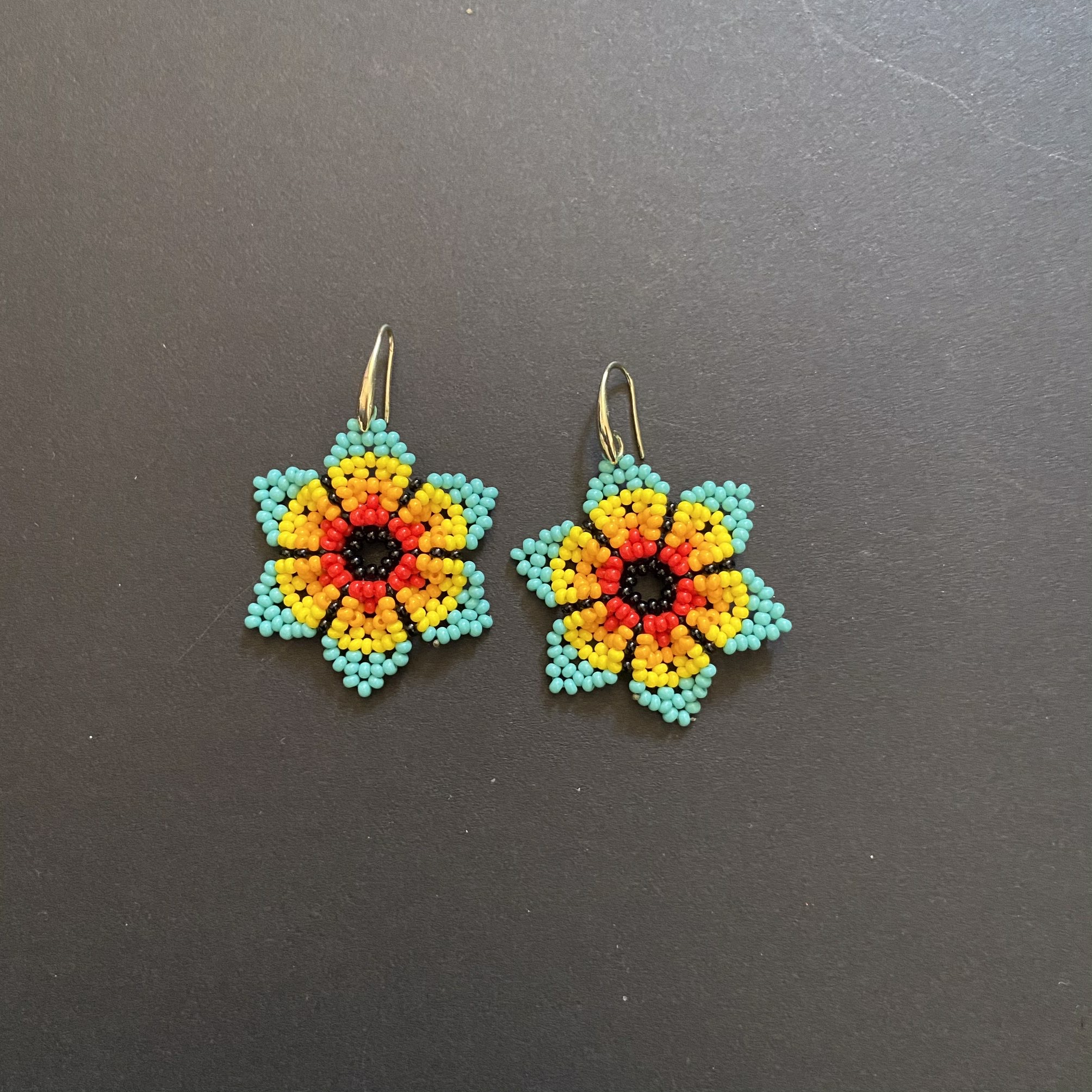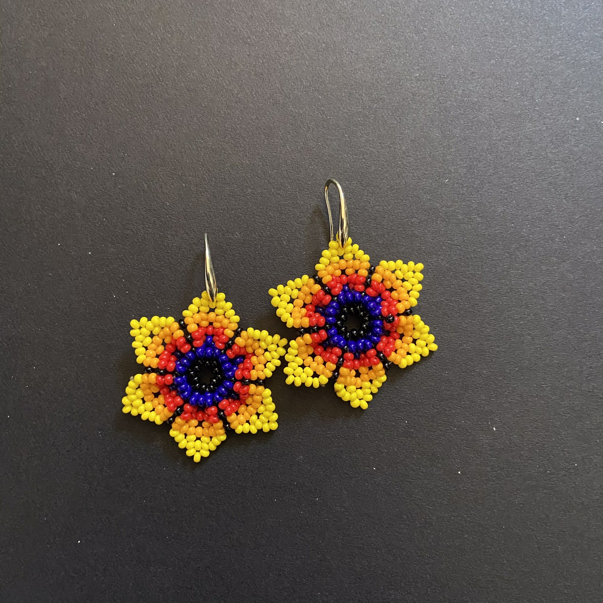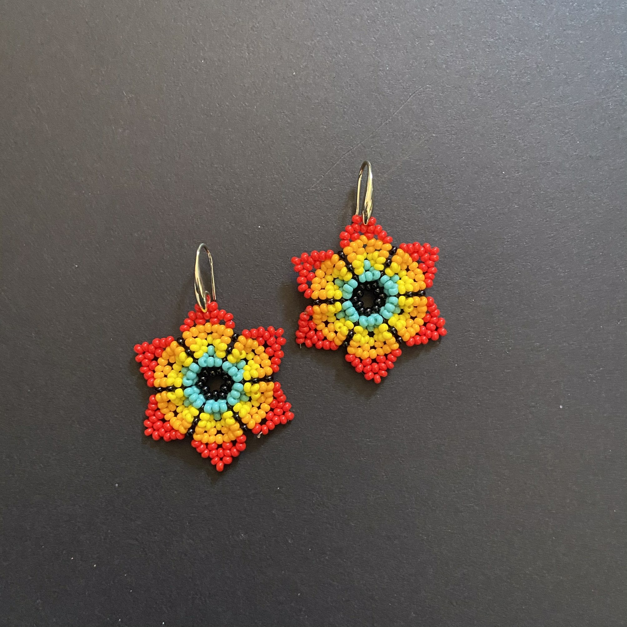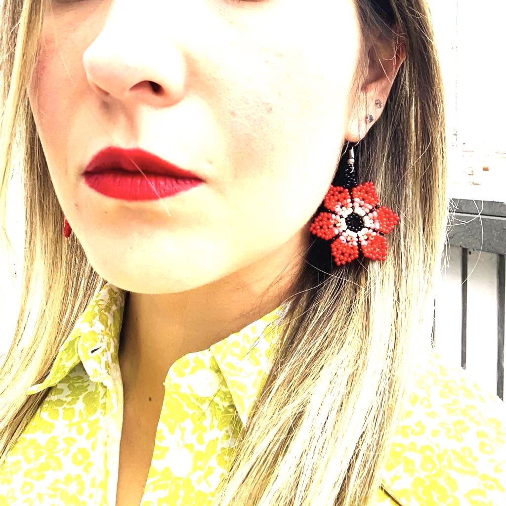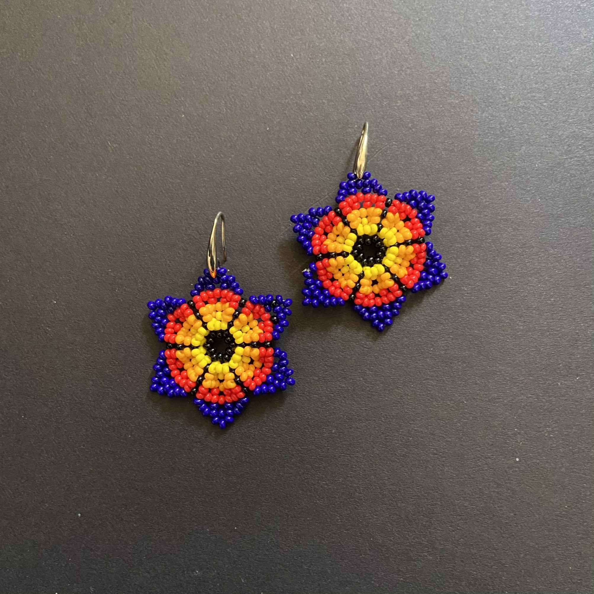Orecchini Huichol, tecnica di lavorazione: le chaquiras multicolore (perline di vetro) vengono intrecciate una ad una fino a completare i disegni degli accessori; Nella sua elaborazione l’artista Huichol sviluppa forme e disegni con simboli rappresentativi della sua cultura e tradizione.